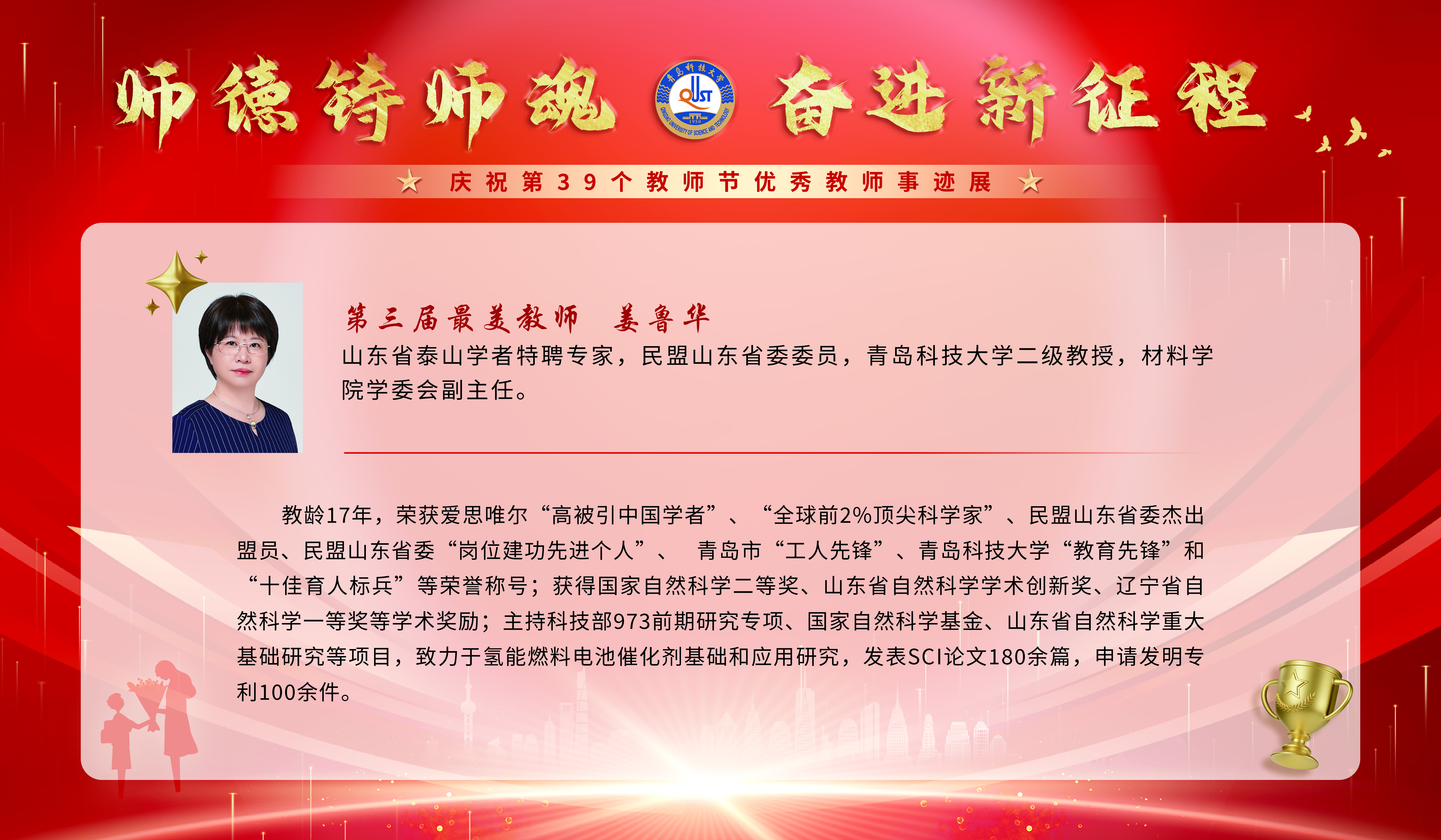 姜鲁华,女,山东省泰山学者特聘专家、民盟山东省委委员、青岛市政协委员,兼任民盟365完美体育基层委员会副主委。1996年 9月参加工作,教龄 17年,现任365完美体育二级教授,材料学院学术委员会副主任。获得的主要荣誉称号有:爱思唯尔“高被引中国学者”、全球前2%顶尖科学家、民盟山东省委杰出盟员、民盟山东省委“岗位建功先进个人”、山东省教书育人楷模、青岛市“工人先锋”、365完美体育“教育先锋”和“十佳育人标兵...