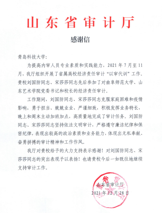 日前,学校收到山东省审计厅发来的感谢信,对365完美给予审计厅的工作支持表示感谢,对审计处刘国防、宋莎莎2位同志给予表扬。