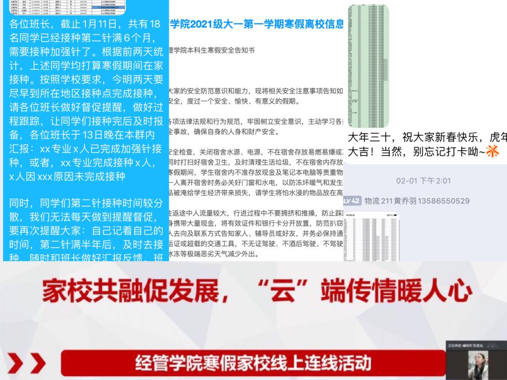 为了让全体学生度过一个平安、健康、祥和的春节假期,经管学院严格贯彻落实学校学院疫情防控的决策部署,主动谋划、系统联动,积极转变常规假期模式,以“四化四到位”确保假期期间立德树人“不断线”,教育管理“不打烊”,全力做好假期学生教育管理服务及春季学期开学准备工作。