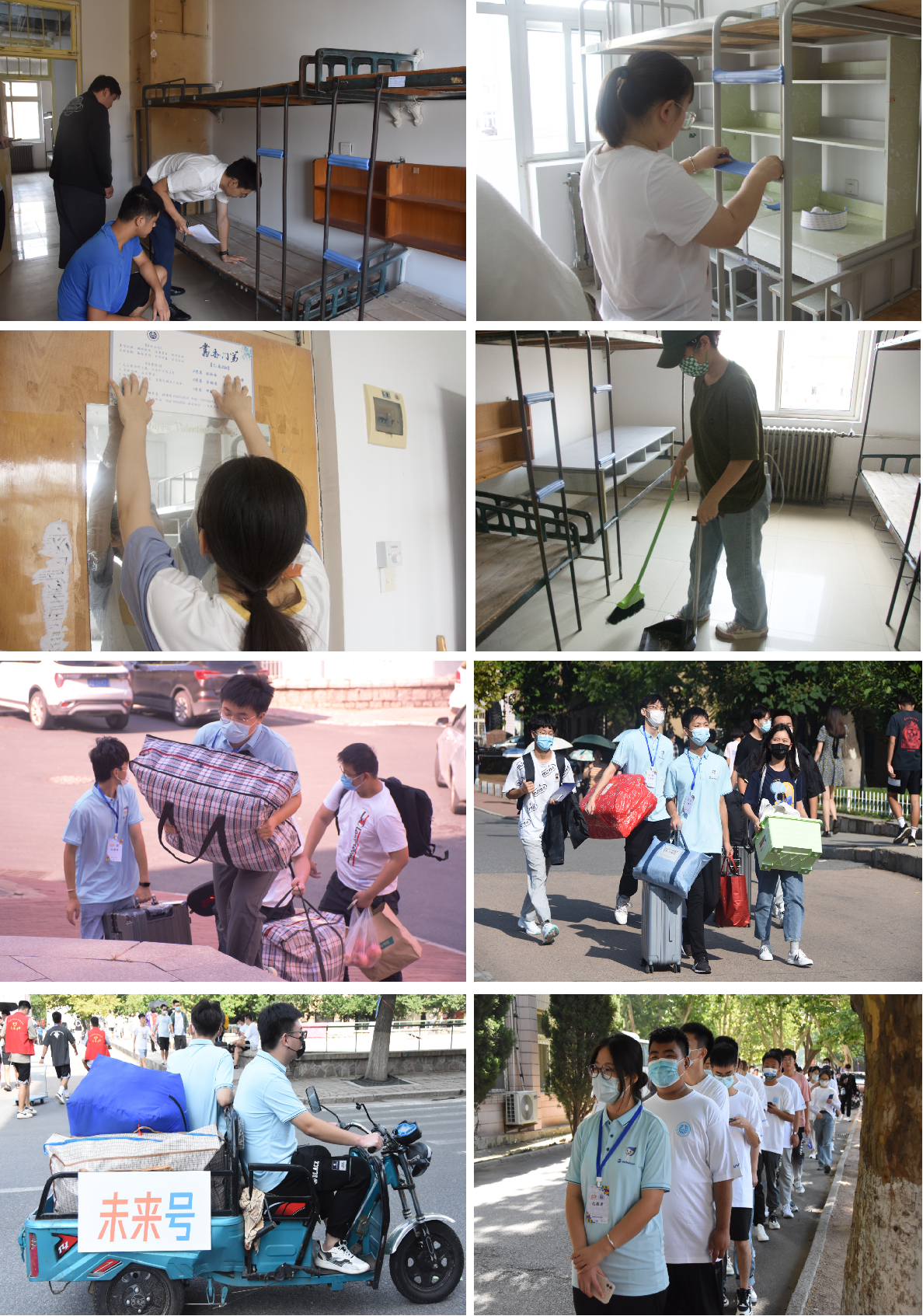 服务暖“新”:对新生宿舍进行精心布置与整理,制作精美的门牌、桌贴、脚垫,着力营造温馨的宿舍环境,提供暖心服务与物资保障,激励学生成长成才。设置“未来号”爱心助力车辆小分队,往返于校门和宿舍楼之间,组建“扬帆化工志愿团”,每位新生安排对接志愿者,确保朝6晚9不停歇,24小时不下线,办理报到、搬运行李、组织核酸、适应校园。