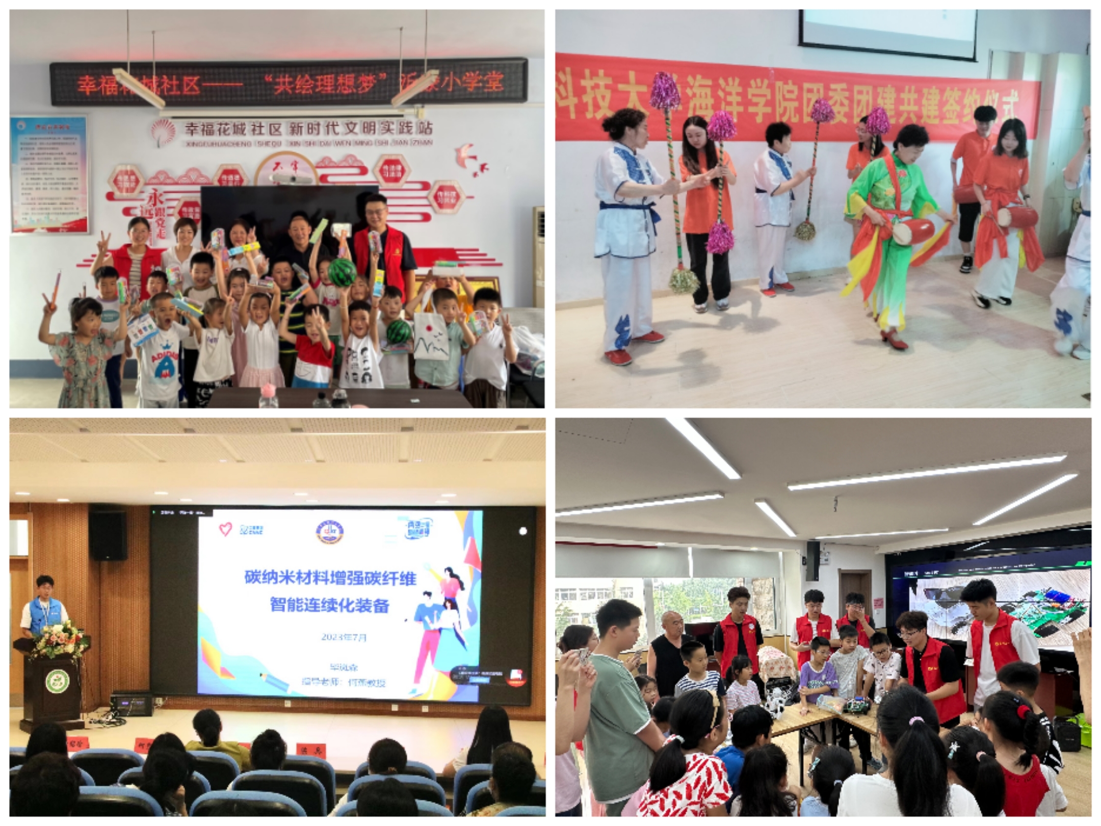 以“社区实践”激发“内循环”,学校团委以“青鸟计划”全力助推“百万大学生进社区”,与青岛市崂山团区委、市北团区委、西海岸团区委建立合作关系,与滨州市阳信县、临沂市河东区达成合作意向。暑假期间共组建427支社区实践团队,参与学生达6013人,打造“青春益爱、追‘锋’基层”“星火e+暖民心”“艺术+”等特色实践育人项目。实践团队将“党的二十大精神进社区”“防溺水/防诈骗主题教育”“‘两弹一星’精神宣讲”等主题融入社区基层治理,为社区发展注入青春动能,实现结对报到常态化、长效化,多渠道参与社区治理,贡献青春力量,推动工作持续走深落实。机电学院“强国有我,‘核’你一起”研究生志愿宣讲团走进崂山区蓝岸馨苑社区开展志愿宣讲;信息学院“星火e+”志愿服务团走进崂山区惠都社区开展“小小科学家”科普课堂活动;外国语学院“懂法守法,普法传法”法治实践团走进城阳区北疃社区,为居民朋友们进行普法社会调研及法治理论普及宣讲;法学院“法益青声,乡约盛夏”公益普法实践宣讲团赴平度市明村镇马戈庄村深入开展基层普法宣讲、调研和反诈宣传志愿服务工作;数理学院“沂路同心 蒙心童趣”社会实践团赴临沂河东区开展科普宣讲志愿服务;体育学院“金晖助老”社会实践团赴崂山区社会福利综合服务中心开展敬老志愿服务;环境学院“续红色经典,扬环胶华章”美丽中国实践团走进市北区滨江路社区开展环保志愿服务;海洋学院“地秧歌”非遗文化传承团赴市北区周口路社区学习传统文化;高密校区“美丽中国,青春行动”宣讲实践团赴城阳区河崖社区开展全国节能宣传周绿色生态宣讲;中德校区“青春聚力正当时”志愿服务团赴黄岛九龙社区开展“暖民心、便民生、学党史”志愿服务活动。
