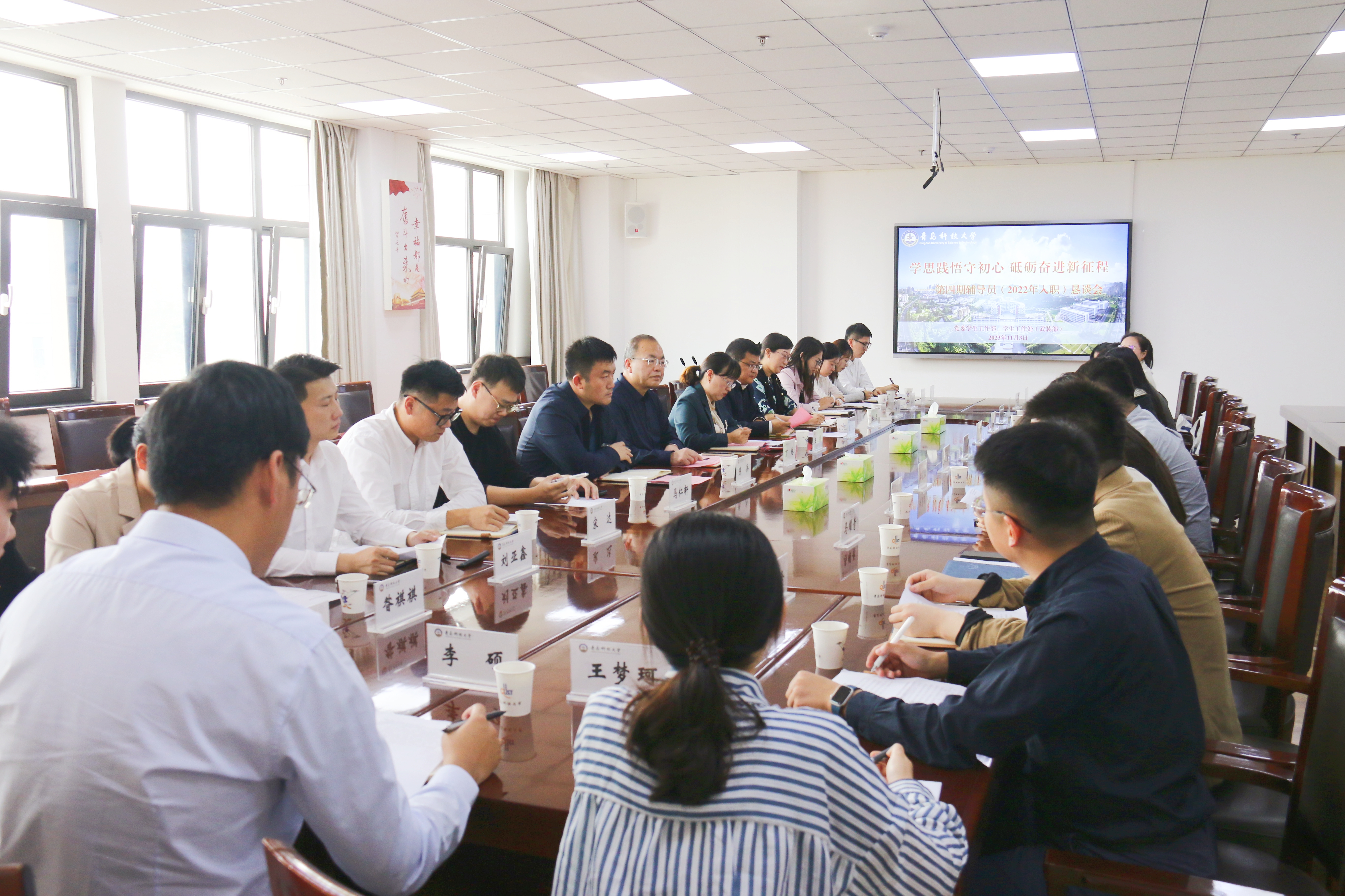11月3日下午,学校“学思践悟守初心,砥砺奋进新征程”——第四期辅导员(2022年入职)恳谈会在崂山校区综合服务楼3015会议室召开。党委常委、副校长丁林出席并讲话。2022年入职的25名辅导员参加会议。