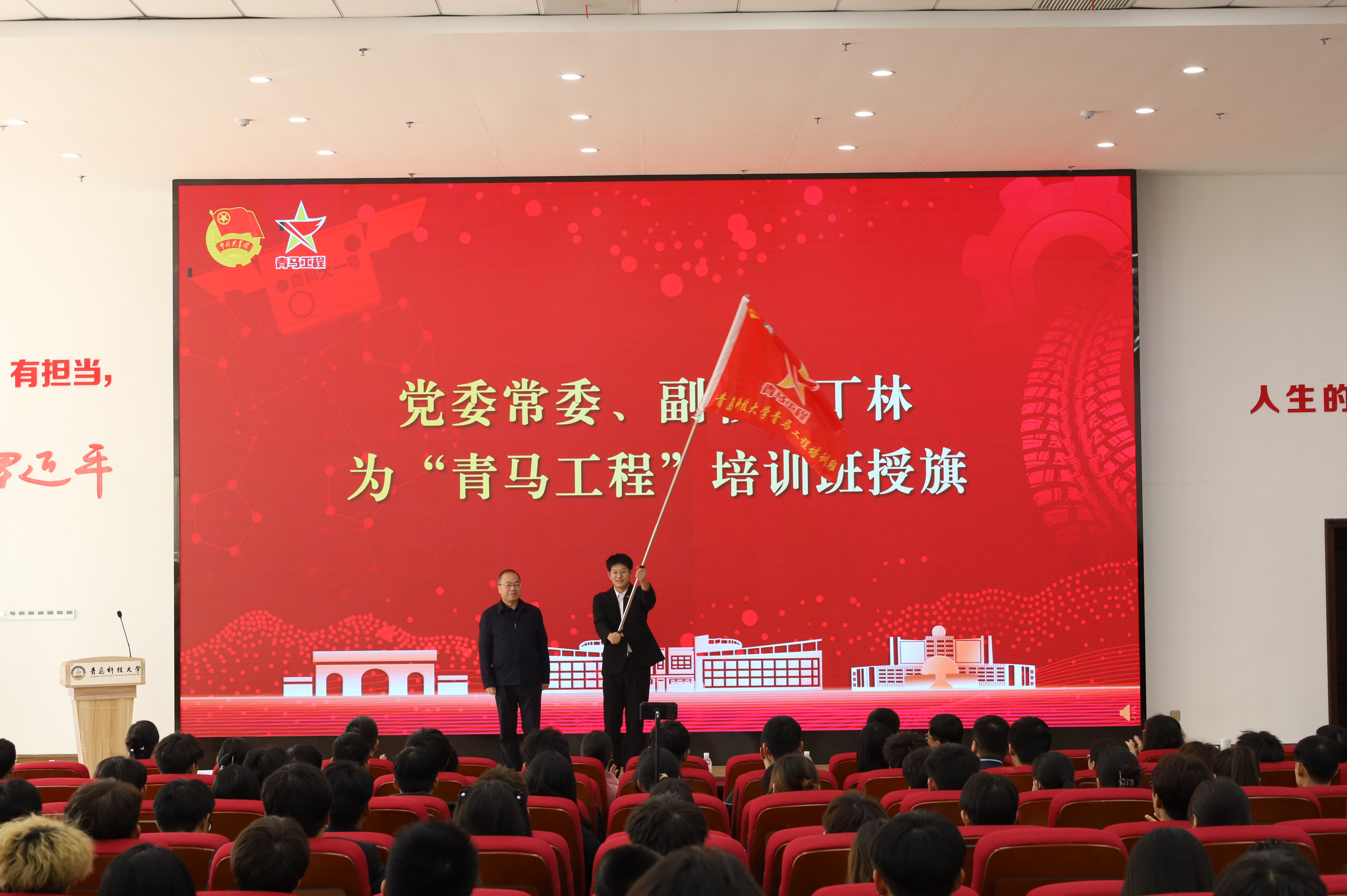 仪式上,丁林为校“青马工程”培训班授旗,并以《中国式现代化之法治化学习思考》为题,为校青马工程、团校学员讲授“开班第一课”。