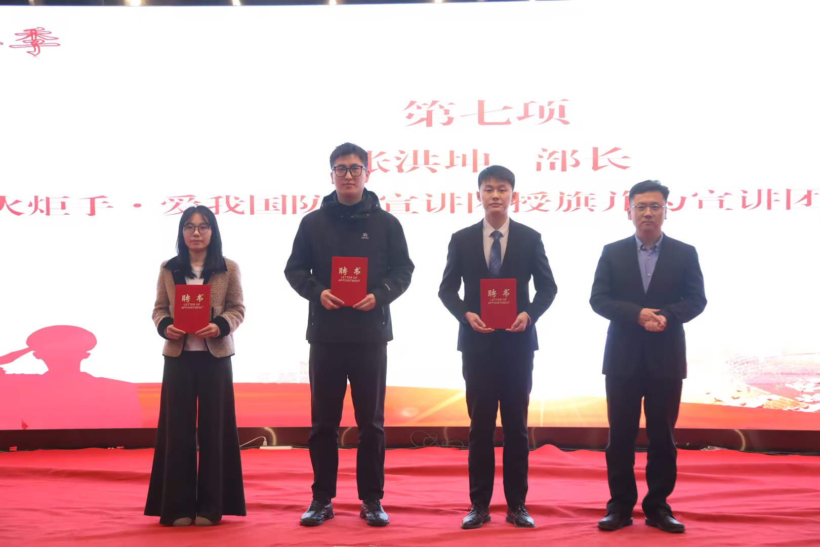 张洪坤为“火炬手·爱我国防”宣讲团授旗并为宣讲团教师代表颁发聘书。