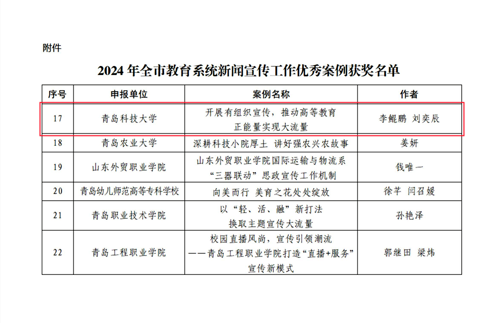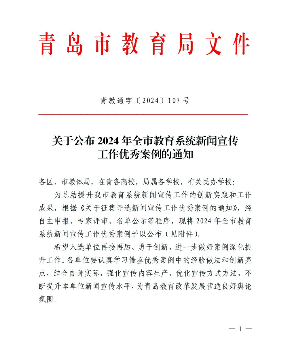 日前,青岛市教育局发布了《关于公布2024年全市教育系统新闻宣传工作优秀案例的通知》,365完美体育报送的案例《开展有组织宣传,推动高等教育正能量实现大流量》成功入选。