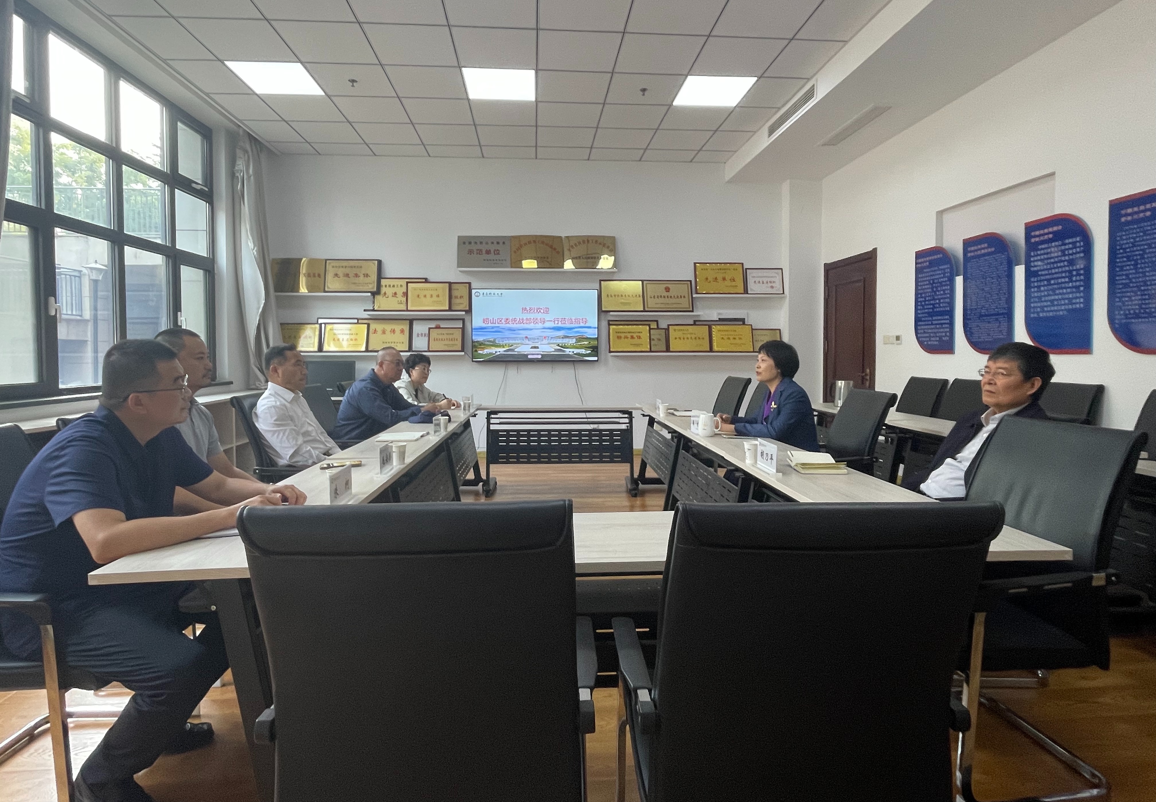 秦姣代表学校党委对马志坚一行表示欢迎,对崂山区委统战部一直以来关心和支持学校的发展表示感谢,并简要介绍了学校的基本情况。她表示,期待以此次交流活动为契机,加强校地合作交流力度,实现资源共享,进一步推动产学研深度融合,促进科技成果转化和产业升级,积极为学校高水平大学建设和区域经济社会高质量发展贡献智慧与力量。