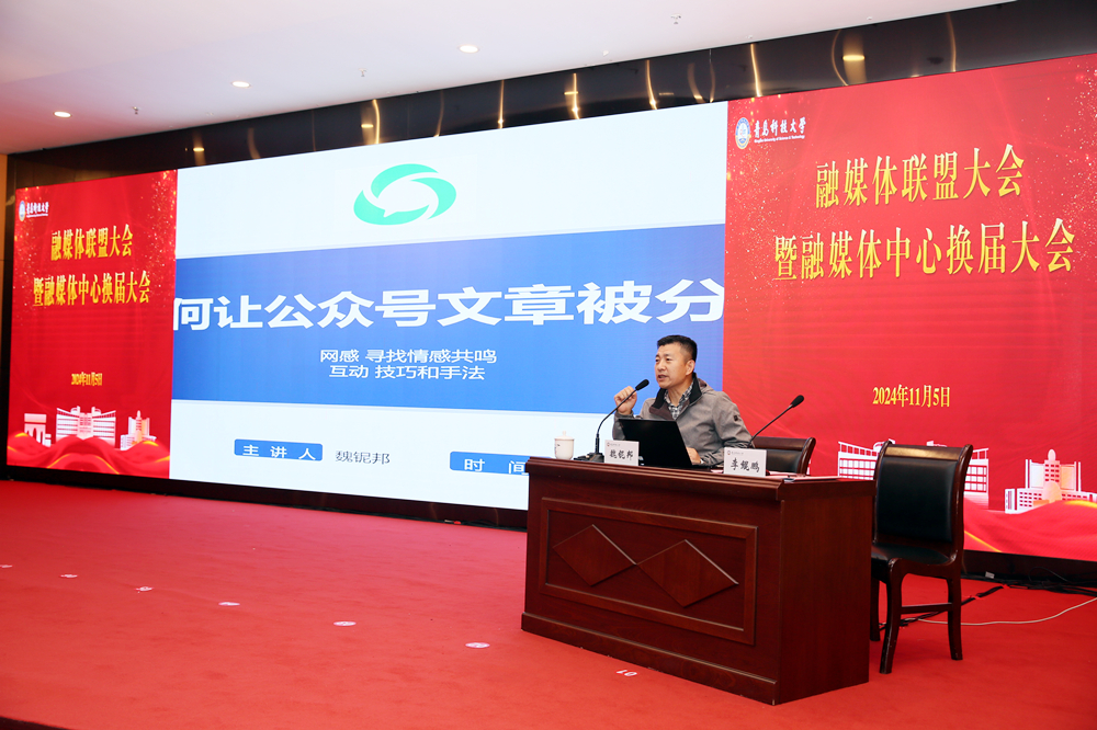 党委宣传部副部长兼新闻中心主任、报社社长李鲲鹏主持会议并代表学校融媒体联盟及融媒体中心作工作报告;传媒学院党委副书记兼副院长刘海波作“青科传媒人”官微运营经验交流;第五届融媒体中心学生代表刘馨发言。