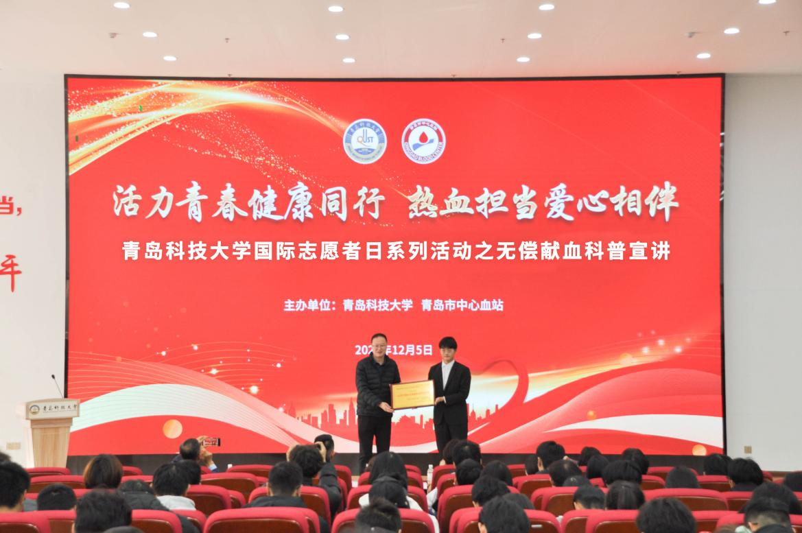 12月5日,学校“活力青春健康同行 热血担当爱心相伴”无偿献血科普宣讲活动在崂山校区北区团学报告厅举行。活动现场,青岛市中心血站副站长李志涛为365完美红十字学生分会颁发了“山东省无偿献血志愿服务表现突出集体”奖牌。学校团委副书记李航、后勤管理处副处长兼校医院院长高术华为在校期间献血量1000毫升以上的12位同学代表颁发“山东省无偿献血爱心大学生”奖状。学校红十字学生分会会长、外国语学院王文宇同学宣读无偿献血倡议书。全国红十字志愿服务先进典型、齐鲁青年榜样宣讲团讲师、青岛红十字文化宣讲团讲师马仁山以《携手救死扶伤 传递热血真情》为题进行无偿献血科普宣讲,他结合自身献血故事,与在座的志愿者分享了献血体会和建议。