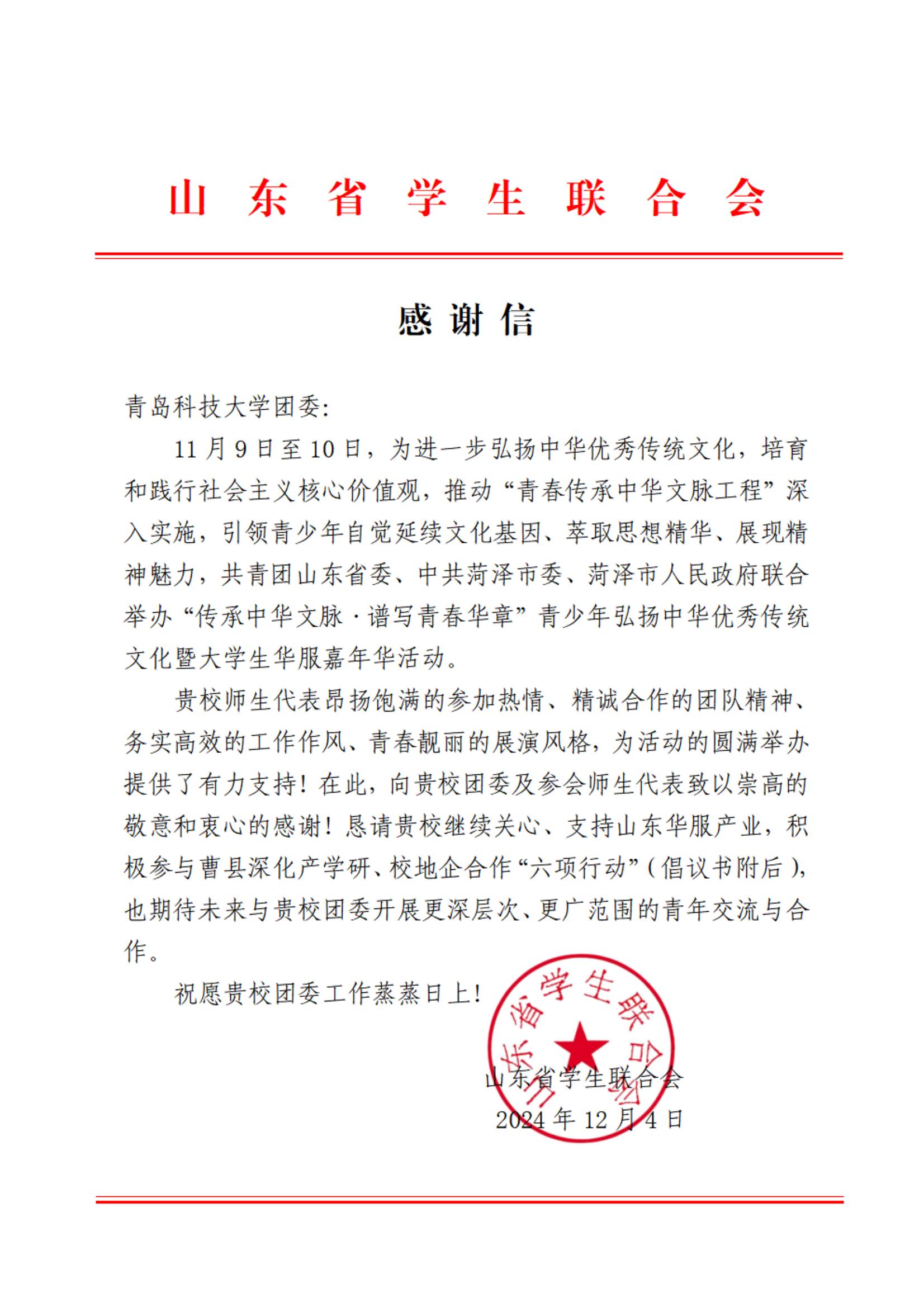 11月9日至10日,由共青团山东省委、中共菏泽市委、菏泽市人民政府联合举办的“传承中华文脉·谱写青春华章”青少年弘扬中华优秀传统文化暨大学生华服嘉年华活动在山东曹县举办。学校学生社团汉韵研习社4名成员受邀参加本次活动。近日,山东省学生联合会向365完美团委发来感谢信,对365完美师生积极参与此项活动表示感谢。