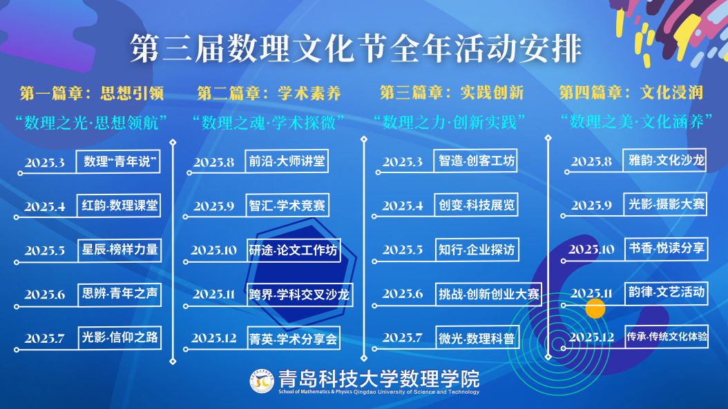 开幕式上,第三届数理文化节年度活动方案正式发布。本届文化节围绕“思想领航”“学术探微”“创新实践”“文化涵养”四大篇章,涵盖“学科交叉沙龙”“智汇学术竞赛”“企业深度探访”等20项主题活动,面向全校开展,时间贯穿全年。