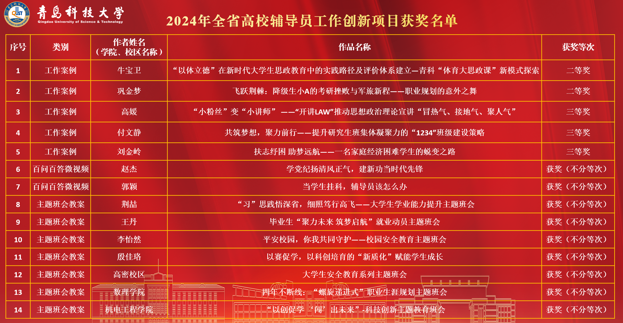 近日,中共山东省委教育工委公布了2024年全省高校辅导员工作创新项目获奖名单。学校报送的项目在评选中脱颖而出,共获得奖项14项,其中辅导员工作案例5项,百问百答微视频2项,辅导员主题班会教案7项,获奖数量创历史新高。