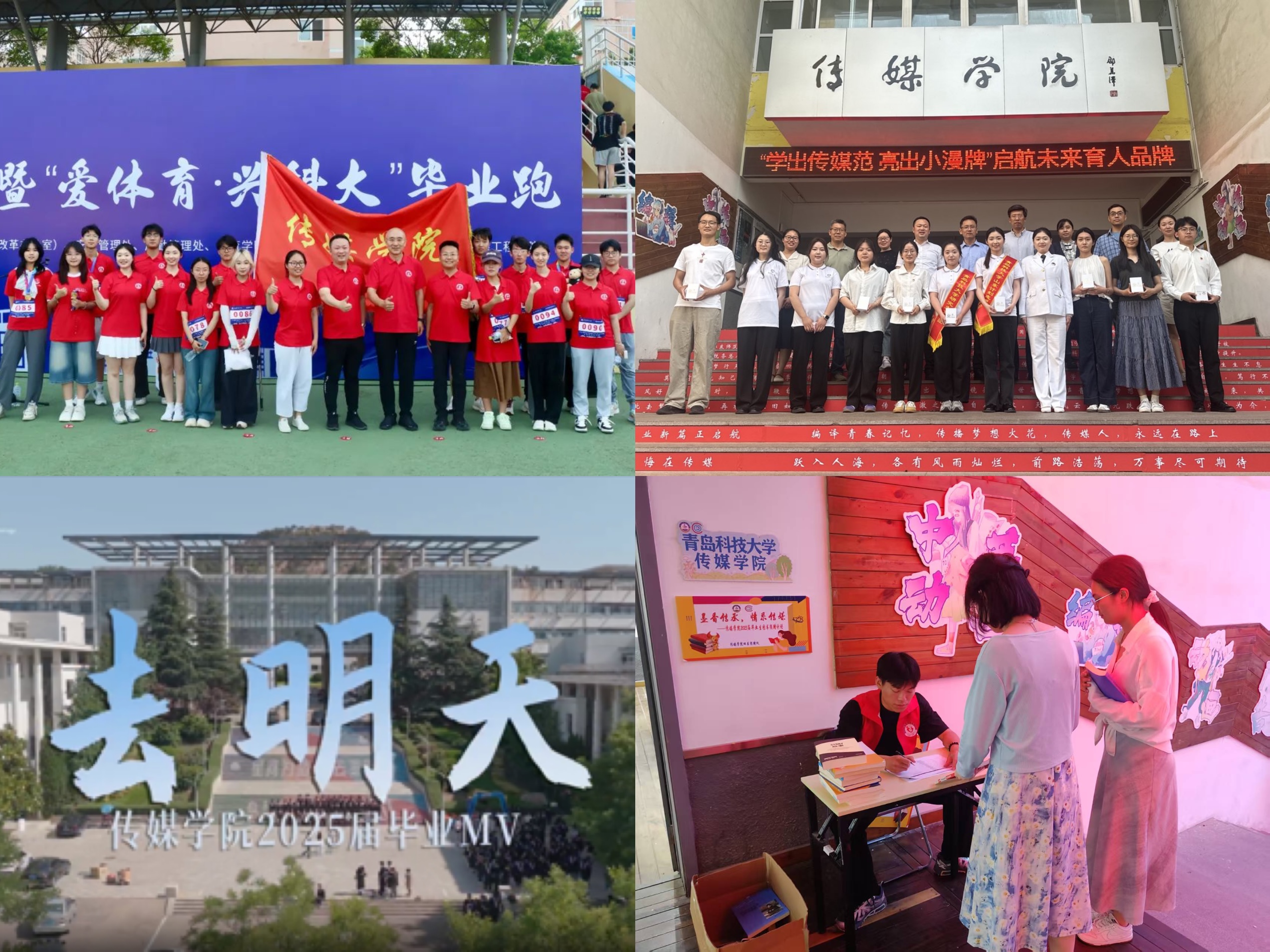 精心设计制作,营造浓厚氛围。学院台阶处贴满毕业寄语,有专业特色的动漫形象张贴在台阶两侧,2025届考研、就业光荣榜有序陈列,展现传媒特色和传媒学子昂扬向上的精神风貌。学院还设置毕业生拍照打卡点,拍摄毕业MV《去明天》,用影像定格青春,留下“传媒”独家记忆。组织学生参加毕业跑,开展毕业季学院、宿舍清扫行动及书籍捐赠活动,向全体毕业生赠送专属文创纪念品,发布“启航专访”等榜样引领推文,系统设计多重元素营造浓厚毕业氛围。
