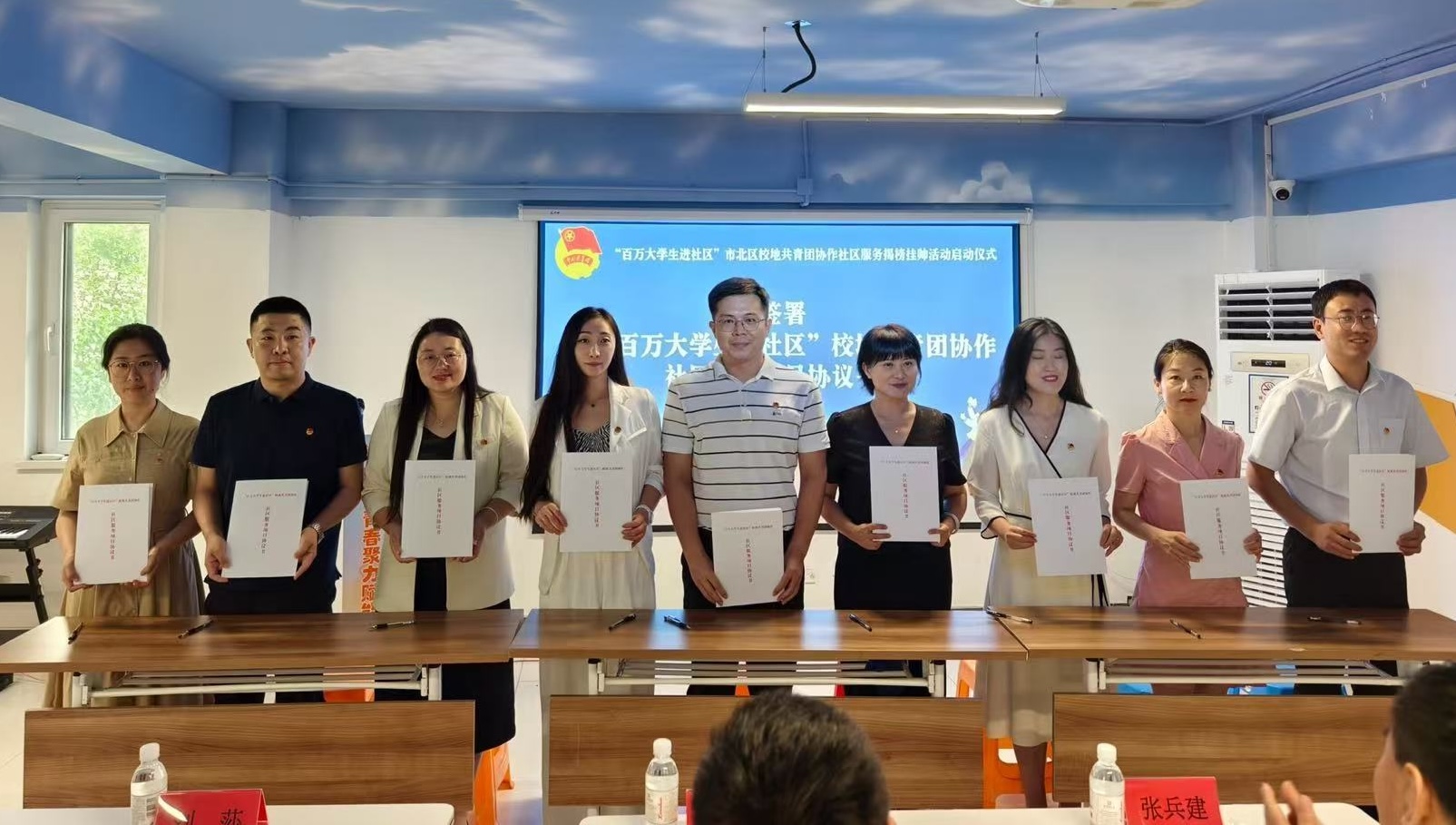 仪式上,市北区团委介绍了“百万大学生进社区”校地共青团协作社区服务揭榜挂帅项目情况,学校团委交流了学校大学生社区实践工作开展情况。校团委书记刘跃宁和市北区团委书记刘莎共同为“大学生社会实践基地”揭牌。市北区委社会工作部张兵建为365完美体育志愿服务队授予“社区服务先锋队”旗帜。7个街道与学校项目服务队签署协议书。