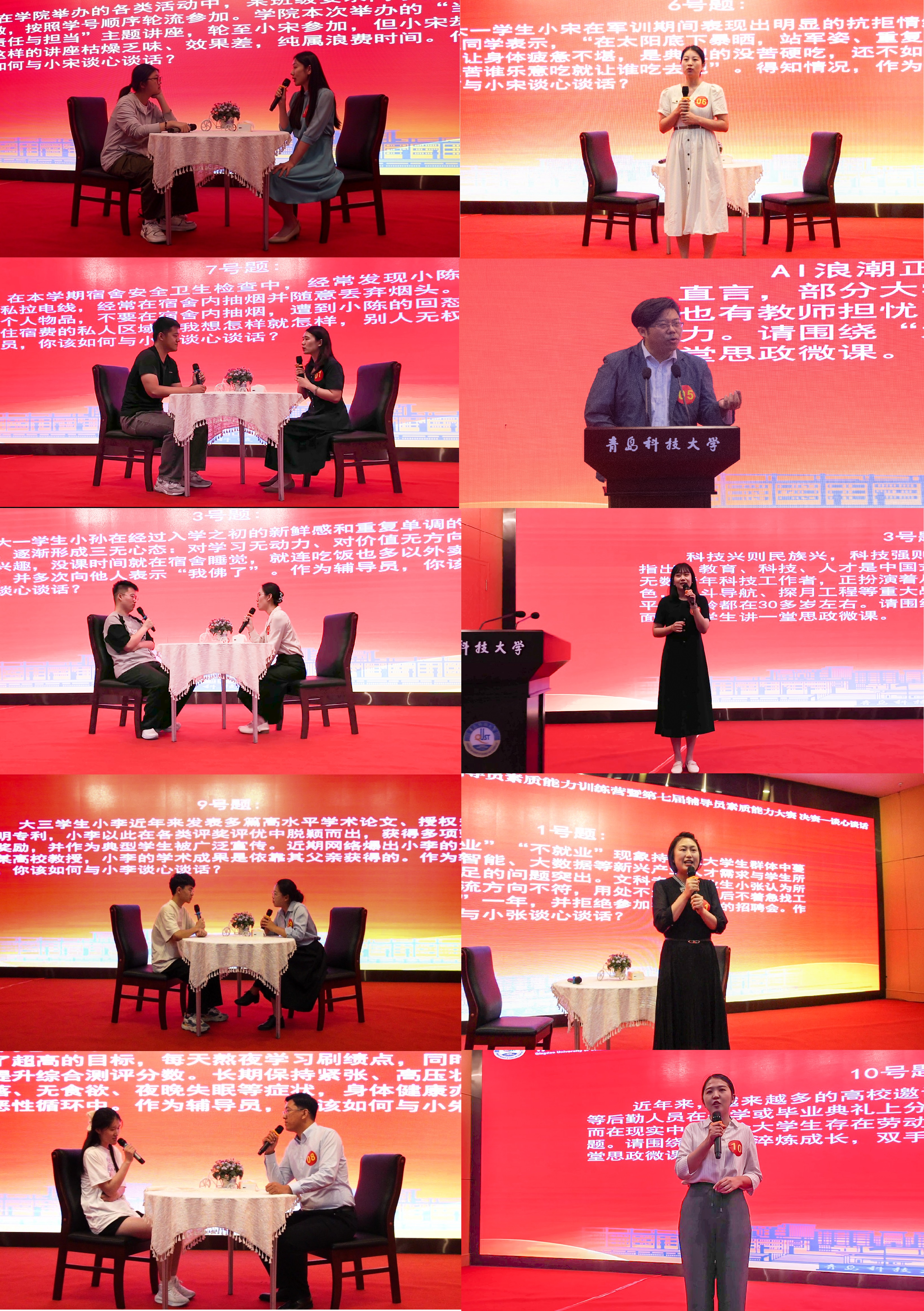 此次比赛设置了谈心谈话、思政微课两个环节,重点考查辅导员的教育引导能力以及帮助、指导学生解决实际问题的能力。比赛中,参赛辅导员以扎实的理论功底和工作实践经验,全面展示了参赛辅导员的政治素养、业务能力和育人本领。