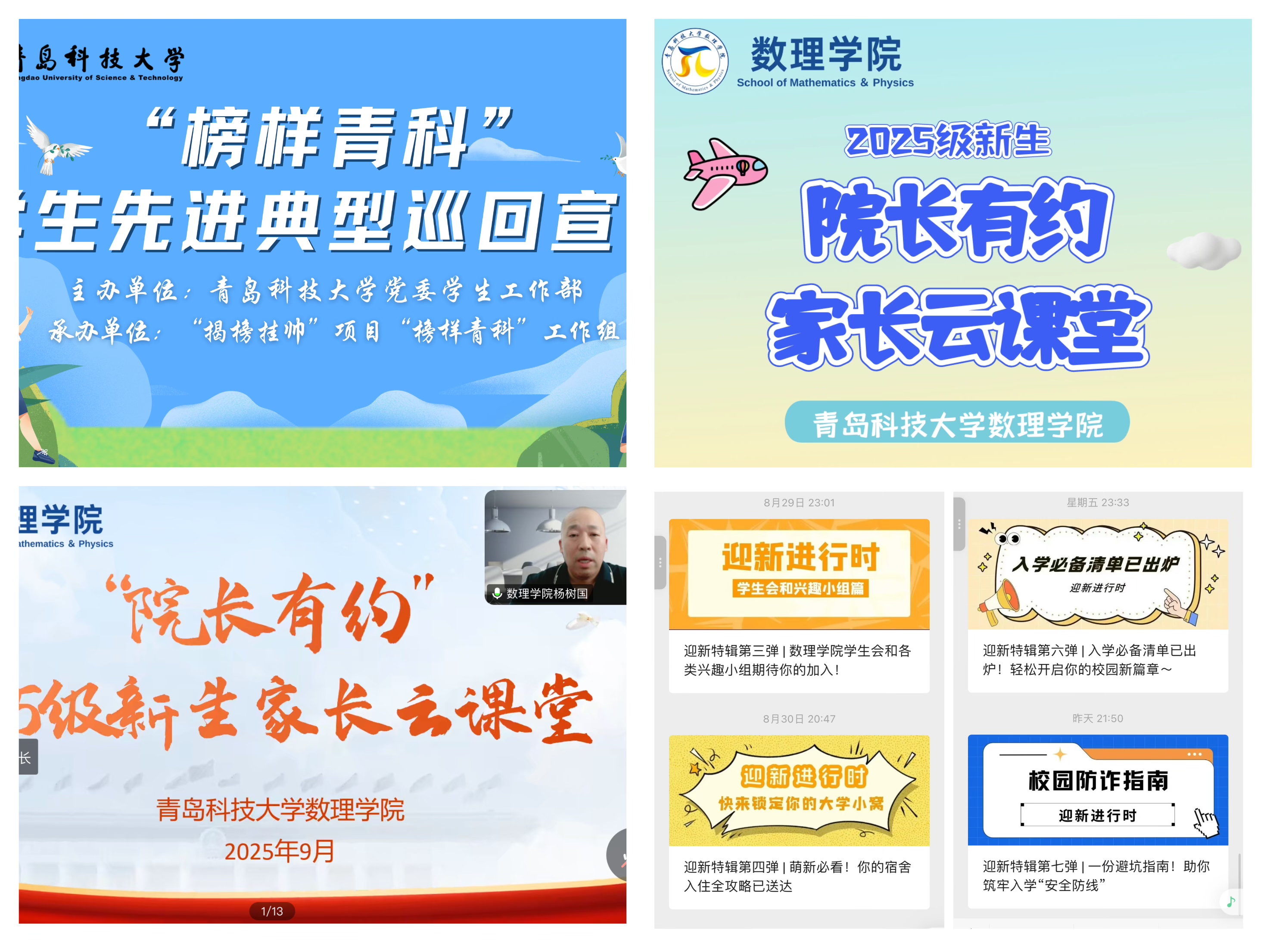 前置:入学教育前置化实现“未入校、先导航”。为打破传统迎新工作的时空限制,数理学院于暑期率先启动“数理启航”线上迎新系列活动。通过组织优秀高年级学生开展线上宣讲、经验分享和答疑互动,实现朋辈引领不断线;开设“院长有约·家长云课堂”,搭建家校沟通桥梁,帮助家长了解学院培养理念与育人体系,共同助力学生成长;官微开设“迎新特辑”专栏,实现“未见其面,先暖其心”的迎新效果。此外,学院还全面开展新生情况摸排,建立“一人一策”关怀档案,重点关注家庭经济困难、身心健康异常等特殊群体,为后续精准帮扶和教育管理奠定坚实基础。这一系列前置举措,真正实现了“未入校、先导航”,让新生和家长感受到学院的用心与温度。