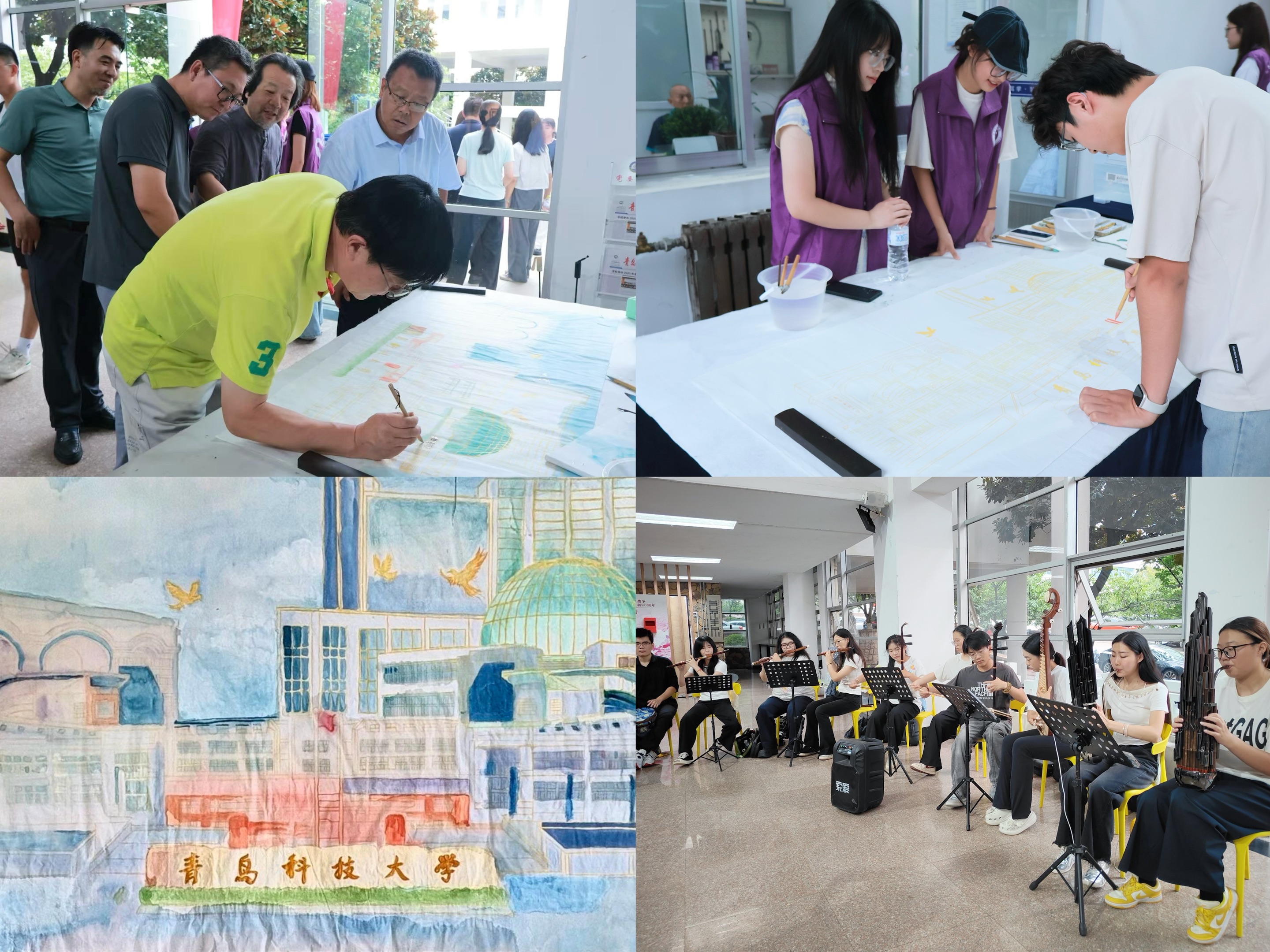 提升互动热度,让新生融入集体氛围。报到现场设置“共绘一幅画”互动区域,新生们执笔绘彩、共同创作,用艺术语言抒发对大学生活的美好憧憬,在协作中拉近距离、凝聚活力。由音乐专业学生组成的 “迎新小乐团” 现场奏响《青春校园》《兰亭序》等经典曲目,筝笛和鸣、丝竹婉转,用悠扬旋律点燃现场氛围,让新生在艺术互动中快速融入新环境。