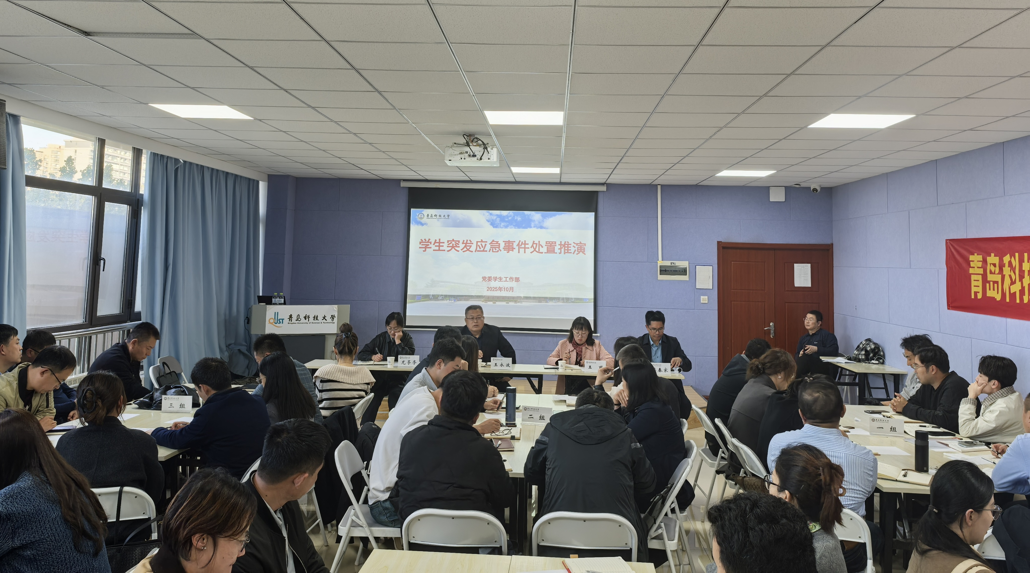 10月22日,学校学生突发应急事件处置推演活动在崂山校区双创学院308会议室举行。安全管理处、党委学生工作部相关负责人,各学院(校区)分管学生工作书记、学工办主任(主持工作副主任)和辅导员代表参加活动。