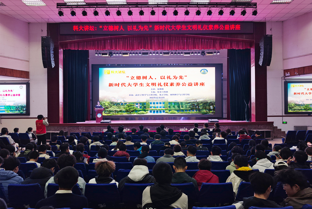 11月13日,学校“立德树人,以礼为先”新时代大学生文明礼仪素养讲座在四方校区文化中心举办。本次活动由党委宣传部主办,高分子科学与工程学院、化工学院、材料科学与工程学院联合承办,特邀全国公共课教材《学生礼仪》主编、知名礼仪专家朱珊珊教授担任主讲。学校党委常委、宣传部部长张洪坤出席活动。
