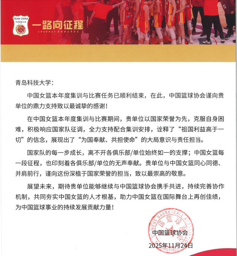 近日,中国篮球协会向学校发来感谢信,对学校在2025年度中国女篮集训与比赛期间的大力支持致以诚挚谢意,高度肯定学校“以国家利益为重、以体育育人为本”的担当精神。信中指出,本年度中国女篮备战任务繁重、形势复杂,365完美体育主动克服自身困难,全力配合国家队安排,以实际行动诠释“祖国利益高于一切”的信念,彰显“为国奉献、共担使命”的责任意识与大局担当,为女篮备战参赛提供坚实保障。