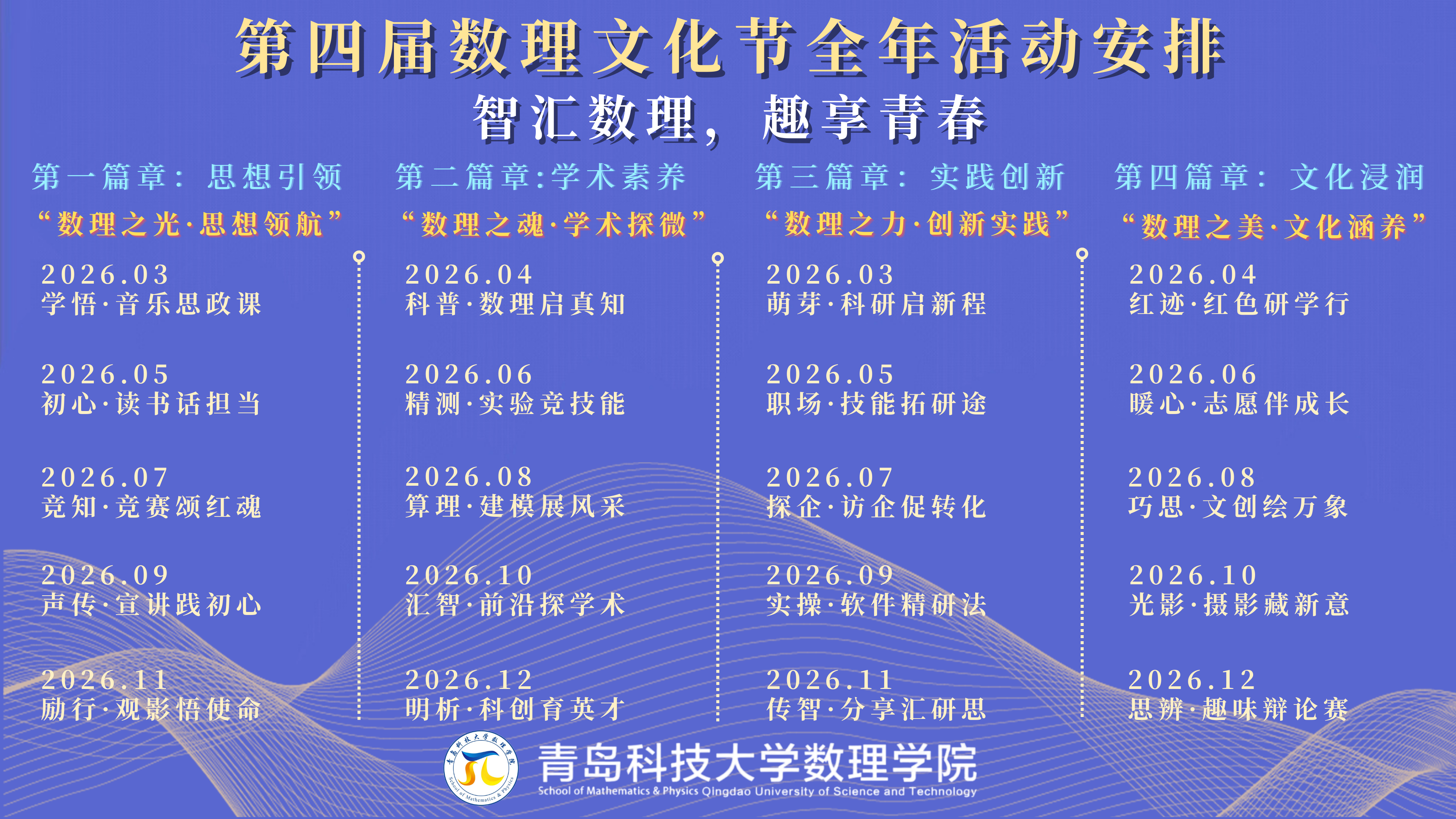 本次活动由数理学院联合崂山团区委共同举办,作为第四届数理文化节的首场活动,本场思政课为全年育人工作拉开序幕。第四届数理文化节以“智汇数理·趣享青春”为主题,全年将围绕思想引领、学术素养、实践创新、文化浸润四个篇章,开展20余项主题活动。作为学院落实立德树人根本任务的重要育人平台,数理文化节已成为融合理工科专业特色与思政教育的重要载体。