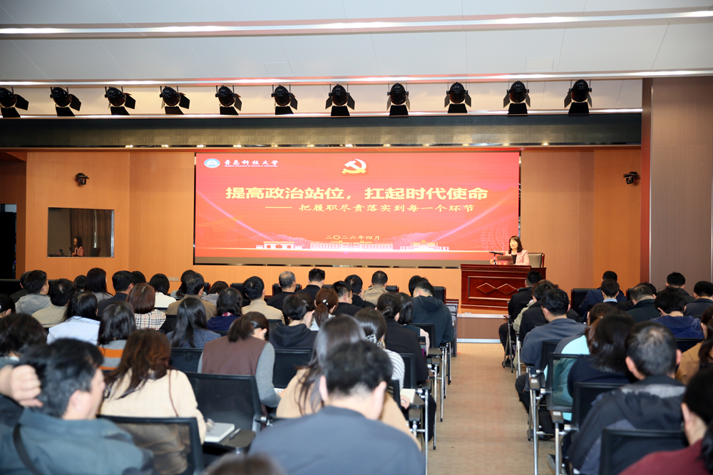 党委常委、统战部部长兼机关党委书记秦姣作题为“提高政治站位,扛起时代使命——把履职尽责落实到每一个环节”的专题辅导报告。报告紧扣机关管理服务职能与立德树人根本任务,围绕树立和践行正确政绩观、抓实高校统战工作、强化风险防范意识等内容进行系统阐释与精准辅导,同时从提高政治站位、强化法治意识、压实工作责任、锤炼过硬作风四个方面,对机关工作提出明确具体要求,为机关干部提升政治素养、强化履职能力、服务学校高质量发展提供了清晰方向与行动指引。