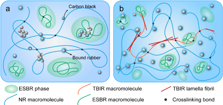 本工作开展了NR/ESBR纳米复合材料的填料网络结构及聚合物交联网络结构的调控研究,并重点研究复合材料结构对硫化胶生热、滚动阻力、耐磨性及耐疲劳性的影响。研究发现,添加高反式丁戊共聚橡胶TBIR可以增加NR / ESBR的交联密度,从而减少大分子之间的内部摩擦(图1)。此外,随着TBIR份数增加,NR/ESBR/TBIR并用胶的基体模量增强,有助于抑制室温静置过程和高温硫化过程中的填料聚集,从而改善填料分散性和聚合物-填料-相互作用。此外,TBIR结晶结构在抑制裂纹扩展方面发挥重要作用。因此,加入TBIR的橡胶复合材料可改善橡胶的聚合网络和填料网络,有助于提高耐磨性,减少生热及滚动阻力,并延长疲劳寿命。