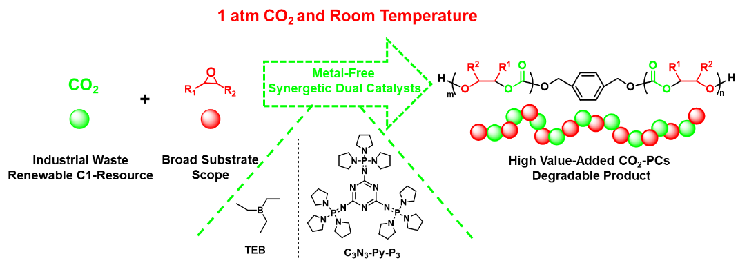 高效催化剂的开发对于CO2-PCs的选择性聚合至关重要。近年来,有机催化剂因其合成简单和无金属残留等优势备受关注。此外,在温和条件下(常温常压)将CO2转化为CO2-PCs,能够进一步的降低能量消耗(无需CO2气体压缩和反应加热等)和减少碳排放。然而,无论是金属催化体系还是有机催化体系,目前仍未能实现常温常压条件下CO2-PCs的有效合成。