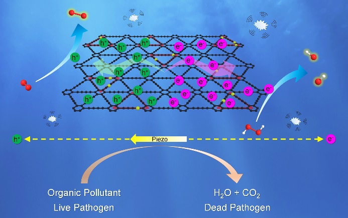 压电场增强石墨炔纳米酶性能。团队通过硫原子掺杂合成了含有丰富缺陷和空位的硫掺杂石墨炔纳米片,硫原子的引入使石墨炔在超声作用下能够显著提高其纳米酶性能。将此纳米酶应用于污水处理中,有较高的TOC去除效率,同时还具有良好的抗菌性能。该工作发表在Nano Today(2022, 43, 101429,影响因子: 20.722)上,365完美博士生白强为该论文的共同一作,隋凝副教授、朱之灵副教授和王兆波教授为共同通讯作者,365完美为唯一通讯单位。