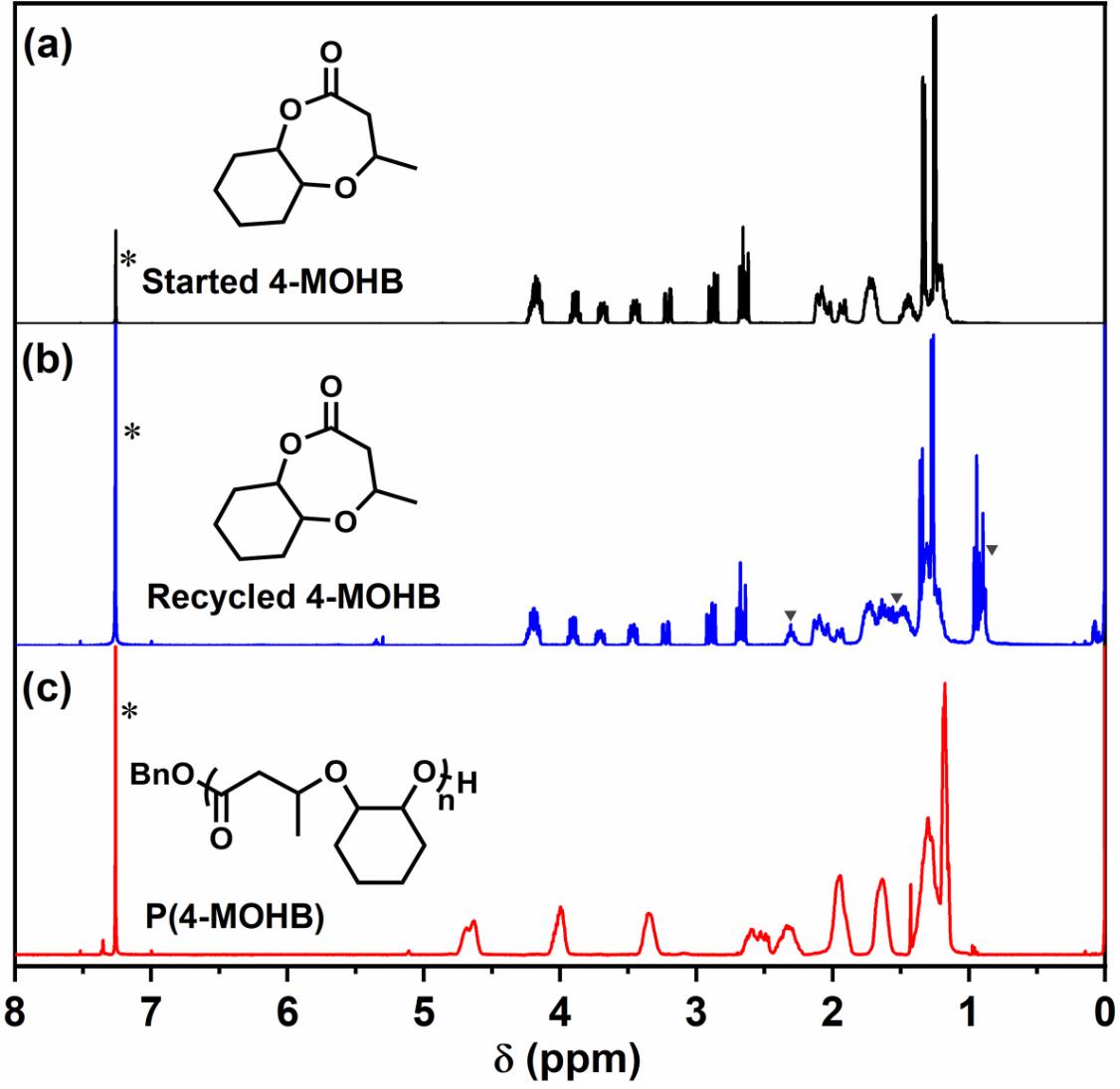 相比于无取代基的醚酯单体(5-二氧环庚酮,DXO),并环结构的引入赋予了4-MOHB在温和条件下聚合和反向解聚的特性。热力学研究得到聚合焓变和熵变分别为-26.4 kJ mol-1和-51.0 J mol-1K-1,对应在25°C下的聚合吉布斯自由能为-11.2 kJ mol-1。以辛酸亚锡或对甲苯磺酸为催化剂,在稀溶液条件下可以将聚醚酯(P(4-MOHB))高效解聚为4-MOHB。此外在本体条件下减压蒸馏,P(4-MOHB)也可在辛酸亚锡或二乙基锌催化下解聚回收得到4-MOHB。所得4-MOHB单体简单纯化后可重新聚合得到与原单体分子量相同的聚合物,实现了P(4-MOHB)材料的闭合循环。