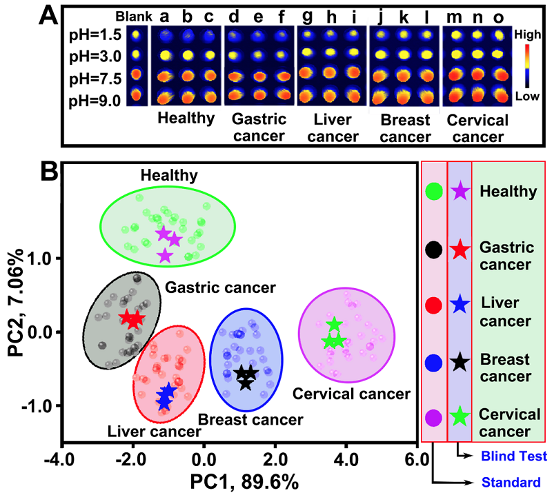 为了解决这一问题,365完美本科三年级丁稼祥同学自大二暑假开始进入化学与分子工程学院徐升豪、罗细亮教授课题组进行科研攻关,开发了一种pH值编程的荧光传感阵列(图1),实现了健康人与胃癌、肝癌、乳腺癌以及直肠癌病人血浆的直接鉴定区分(图2)。同时,15例未知癌症血浆样本也被准确地被鉴定区分,该工作为癌症等重大疾病的早期筛查提供了快速、简便且有效的新方法。