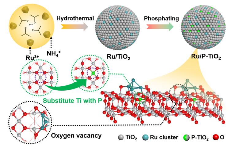 本文设计制备了一种痕量磷掺杂的富氧缺陷二氧化钛负载Ru团簇复合材料—Ru/P-TiO2。该材料在碱性介质中展现出类似于商业Pt/C的几何活性,且质量活度比Pt/C提升了34.3倍。实验结合理论计算研究表明,金红石相TiO2基底相较于锐钛矿相TiO2基底更有利于增强HER活性。金红石TiO2表面丰富的氧空位有利于促进水的吸附和解离,而掺杂的P以P5+形式存在,取代部分Ti4+,有利于促使吸附氢从表面Ru位点溢流到表面P位点从而促进H2的形成。由此可见,相工程和磷掺杂协同提升了碱性HER活性。