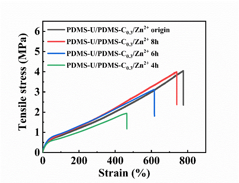 图3.在37oC下,PDMS-U/PDMS-C0.3/Zn2+弹性体修复不同时间后的应力应变曲线