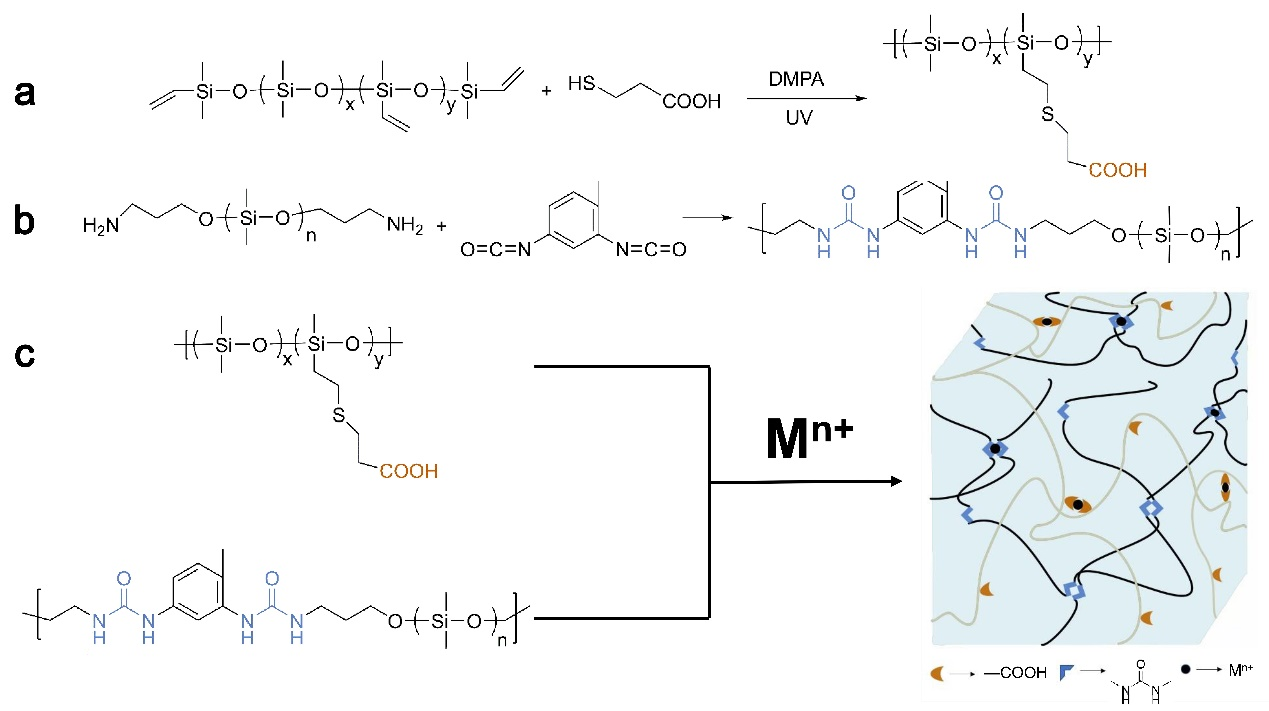图1.(a)PDMS-C的合成,(b)PDMS-U的合成,(c)PDMS-U/PDMS-C/Mn+的制备路径