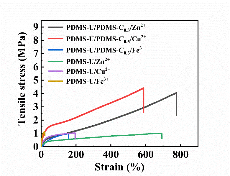 图2.不同金属离子配位的聚硅氧烷弹性体的应力应变曲线
