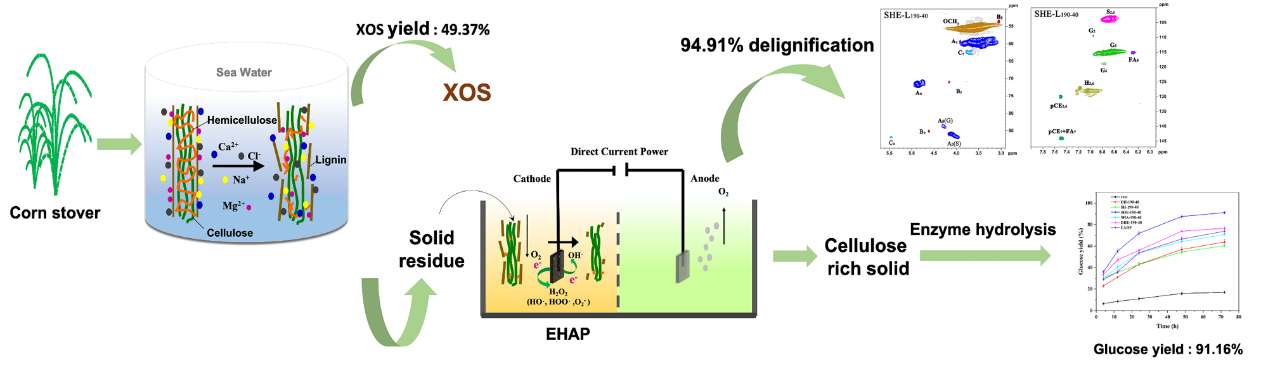 在此基础上,该团队提出了一种新颖的海水水热-电催化两步预处理技术,基于半纤维素优先策略实现了秸秆全组分的精准拆解与高效转化,同时制备低聚糖、可发酵性糖和小分子量木质素化合物,并揭示了主要组分的降解转化机制。相关研究成果以“Promising seawater hydrothermal combining electro-assisted pretreatment for corn stover valorization within a biorefinery concept”为题目,发表在生物质领域国际知名期刊Bioresource Technology (Bioresource Technol.2022, 351:127066. IF= 11.889,中科院一区TOP期刊)。论文第一作者为海洋学院硕士研究生吴越,通讯作者为吉喆副教授,365完美体育为第一单位和唯一通讯单位。该项工作得到了国家自然科学基金、山东省重大创新工程的资助。