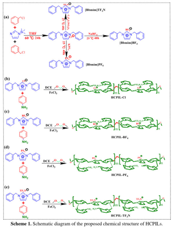 作者首先通过三甲基硅基咪唑和苄基氯合成离子液体单体[Bbmim]Cl,将[Bbmim]Cl与NaBF4交换以获得[Bbmim]BF4。采用类似的方法获得[Bbmim]PF6和[Bbmim]TF2N。最后,使用[Bbmim]BF4/[Bbmm]PF6/[Bbmim]TF2N作为单体,通过Friedel-Crafts烷基化与不同的辅助交联剂交联,实现了多种不同湿润性材料(HCPIL-BF4/HCPIL-PF6/HCPIL-TF2N/HCPIL-Cl)的制备。并且根据接触角的测量等手段证明各类材料的对水、油分别体现出不同的亲和力,同时证明了材料的具有优异的循环稳定性。