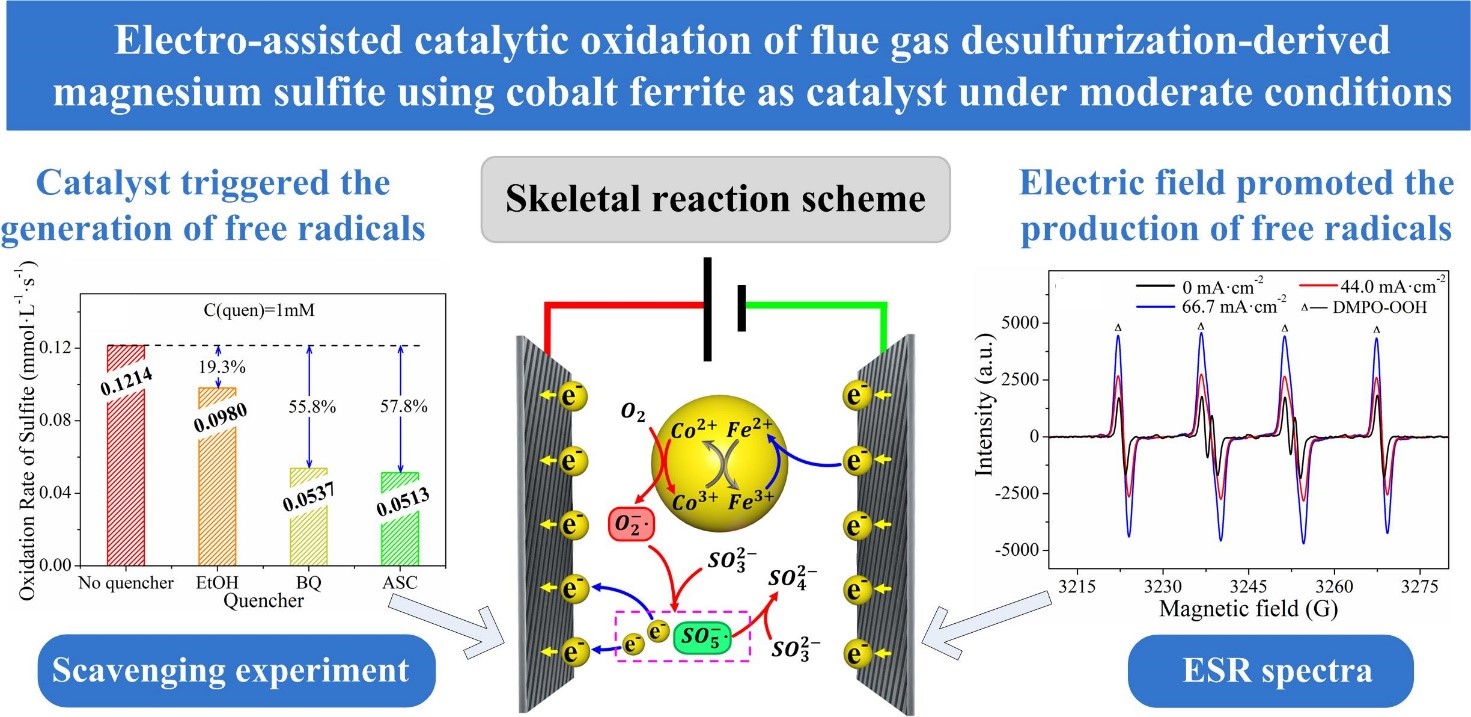 近日,化工学院田红景、郭庆杰团队在化学链碳捕获领域取得系列进展。该团队在2021年提出一种基于化学链工艺的硫蒸气还原再生镁基脱硫剂技术(Journal of Cleaner Production,中科院大类一区TOP期刊,影响因子11.072,10.1016/j.jclepro.2020.124720)的工作基础上,继续聚焦在化学链技术耦合脱硫剂再生回收领域,进行了电场强化下高效钴基催化氧化镁基脱硫剂的研究分析。相关研究成果以“Electro-assisted catalytic oxidation of flue gas desulfurization-derived magnesium sulfite using cobalt ferrite as catalyst under moderate condition”为题目,发表在中科院分区环境科学与生态学大类一区TOP期刊Journal of Cleaner Production上(10.1016/j.jclepro.2022.135745)。论文唯一通讯作者为田红景,365完美体育为第一单位和通讯单位,田红景副教授被国家留学基金委公派进行博士后研究时的所在单位美国约翰斯霍普金斯大学为第二单位。