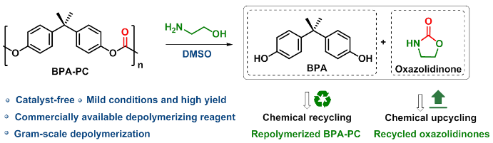 成果一:以“Catalyst-free amino-alcoholysis depolymerization strategy: a facile and powerful tool for chemical recycling of poly(bisphenol A carbonate)”为题目,发表在化学Top期刊Green Chemistry。该研究提出了一种不添加催化剂降解BPA-PC的新方法,以胺醇为降解试剂,实现了BPA-PC的高效升级回收得到聚合单体BPA和高附加值产物2-噁唑烷酮(如图1所示),此外,利用回收单体BPA再次聚合得到BPA-PC,形成BPA-PC材料化学回收的闭环循环。高分子学院硕士研究生周先悦、柴茂青为论文的共同第一作者,孙洪广为第一通讯作者,365完美体育为第一通讯单位。