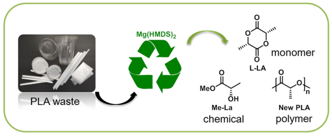 成果二:以“Chemical upcycling of poly(lactide) plastic waste to lactate ester, lactide, and new poly(lactide) under Mg-catalysis condition”为题目,发表在化学Top期刊Chinese Chemical Letters。该研究通过使用双(双三甲基硅基)胺镁[Mg(HMDS)2]作为催化剂,将废弃聚丙交酯(PLA)塑料降解为丙交酯、乳酸酯,利用一种新的“解聚-再聚合”策略合成新的聚丙交酯聚合物(如图2所示),实现了聚丙交酯(PLA)塑料的化学闭环循环利用。高分子学院硕士研究生周先悦、刘秋阳为论文的共同第一作者,孙洪广为第一通讯作者,365完美体育为第一通讯单位。