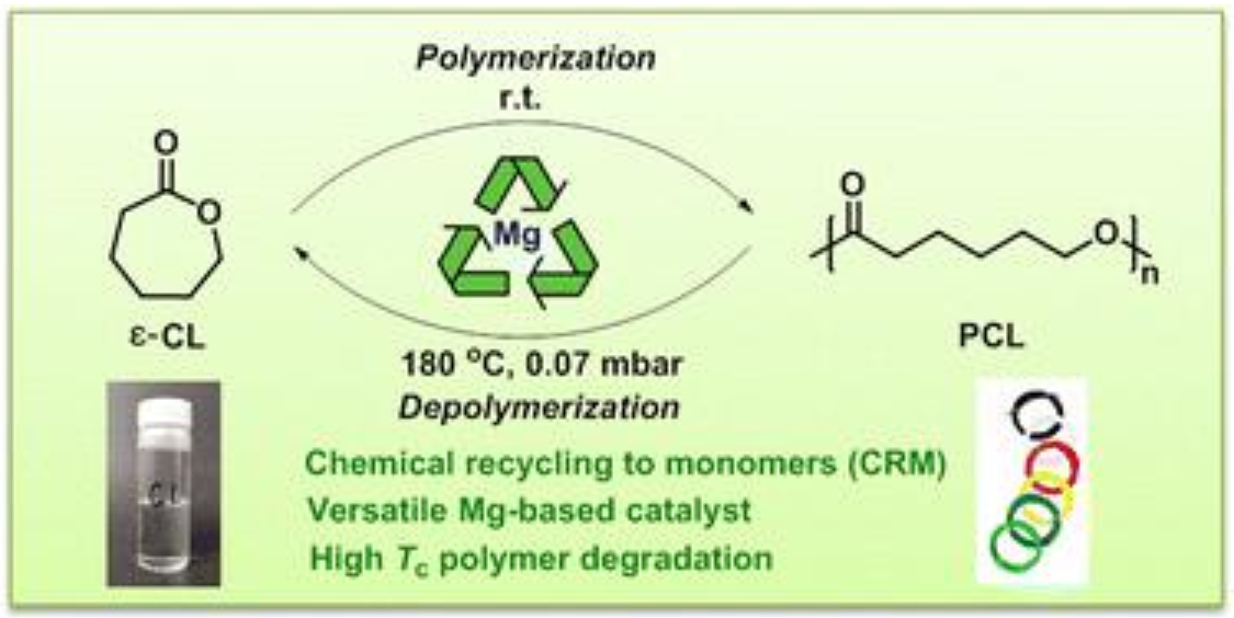 成果三:以“Closed-loop chemical recycling of poly(ε-caprolactone) by tuning reaction parameters”为题目,发表在Polymer Chemistry期刊。该研究首次报道了以双(双三甲基硅基)胺镁[Mg(HMDS)2]作为催化剂,实现“ε-CL到PCL再到ε-CL”的聚合单体闭环循环和“PCL到ε-CL再到PCL”的聚合物闭环循环过程(如图3所示),建立了商业医用材料PCL的循环生命周期。高分子学院硕士研究生苏家丰为论文的第一作者,孙洪广为第一通讯作者,365完美体育为第一通讯单位。