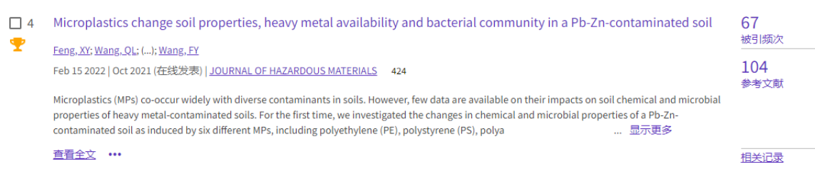 (1)论文1发表于环境类top期刊《Resources, Conservation & Recycling》(https://doi.org/10.1016/j.resconrec.2022.106503),累计被引22次。该文系统评述了微塑料在陆地植物中的吸收、转运和植物毒性,并探讨了当前研究的不足,指明未来需要优先研究的方向。
