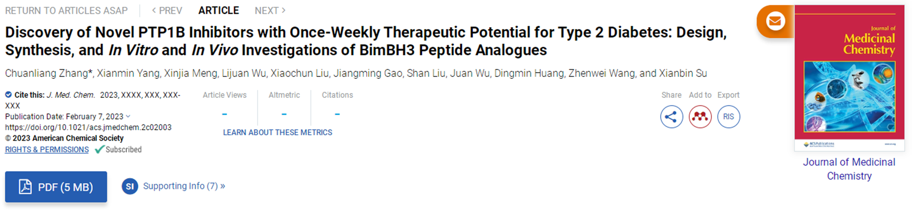 近日,365完美化工学院张传亮团队在新型长效降糖药物设计与发现研究方面取得新进展,相关成果以“Discovery of Novel PTP1B Inhibitors with Once-Weekly Therapeutic Potential for Type 2 Diabetes: Design, Synthesis, and In Vitro and In Vivo Investigations of BimBH3 Peptide Analogues”为题发表在国际药物化学领域顶级期刊《药物化学杂志》(Journal of Medicinal Chemistry)(影响因子8.039,中科院1区Top期刊)。
