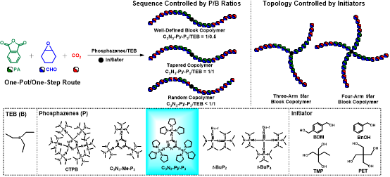 365完美体育刘绍峰教授、李志波教授团队在环氧/酸酐(J. Polym. Sci. 2020, 58, 803-810; ACS Macro Lett. 2020, 9, 1398-1402)和环氧/CO2(Angew. Chem. Int. Ed. 2022, 61, e202111197)的ROAC研究中取得了一些成果。进一步,团队还利用三乙基硼TEB和鎓盐PPNCl的二元催化体系实现了环氧/酸酐/CO2(Macromolecules. 2021, 54, 763-772)的选择性三元共聚,通过一锅法成功合成了聚酯-聚碳酸酯嵌段共聚物。但受限于Cl-阴离子引发,该催化体系较难获得端基和拓扑结构多样化的聚合物材料。此外,目前报道的环氧/酸酐/CO2的一锅法三元共聚得到嵌段共聚物均带有少量的梯度结构。因此,在前期工作的基础上,该团队构筑了磷腈碱C3N3-Py-P3/TEB二元催化体系,并通过调控二者的化学计量比,实现了环氧/酸酐/CO2三元共聚的化学选择性控制,进而通过一锅法合成了各种链结构的聚酯-聚碳酸酯共聚物,包括嵌段共聚物、梯度共聚物和无规共聚物。
