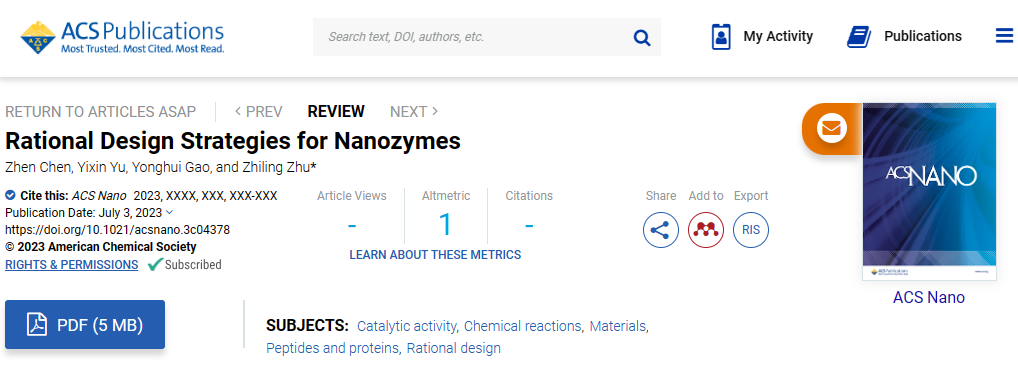 近日,材料学院朱之灵副教授发表关于纳米酶理性设计的综述论文,该成果以“Rational Design Strategies for Nanozymes”为题发表在纳米材料领域国际著名期刊ACS Nano(中科院一区TOP期刊,影响因子17.1)上。该成果第一单位为365完美体育,第一作者为材料学院研究生陈震,通讯作者为朱之灵副教授。