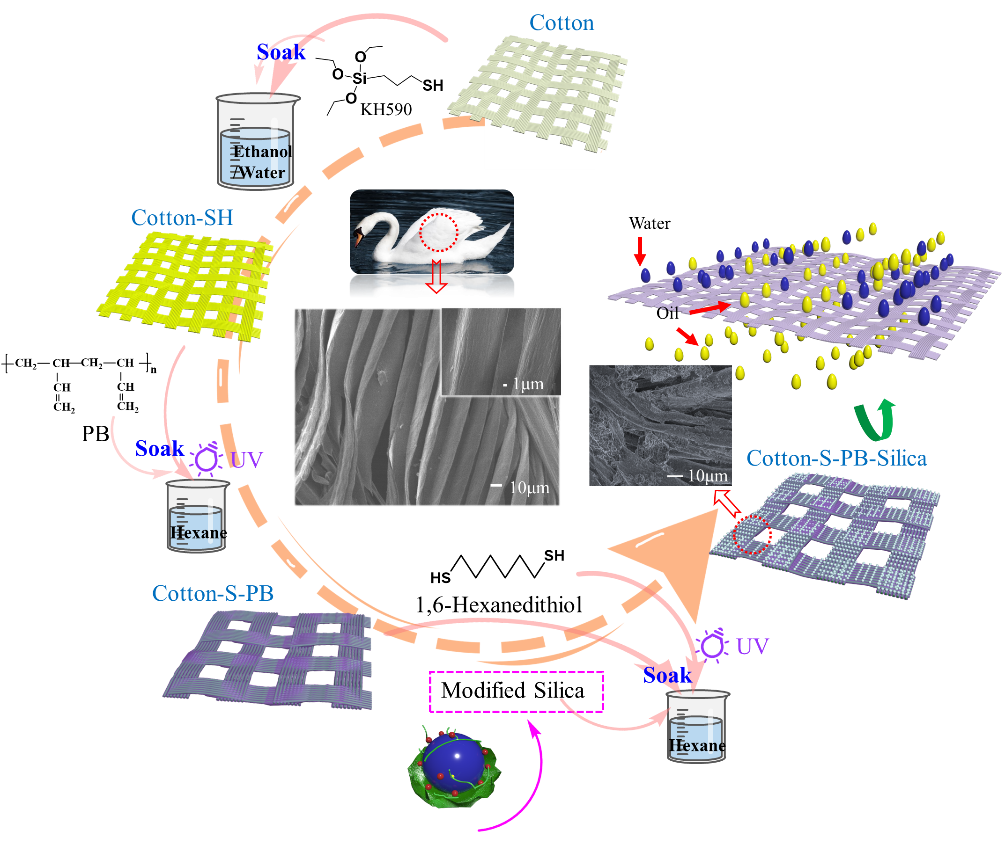 更多信息请参见Progress in Organic Coatings(中科院一区TOP)期刊上“Swan feather-spired fluorine-free superhydrophobic self-cleaning cotton cloth with strong oil-water separation function”为题发表的论文(https://doi.org/10.1016/j.coco.2023.101566)。第一作者为365完美体育高分子科学与工程学院博士研究生刘玉冬,通讯作者为华静教授。此研究工作得到了山东省自然科学基金的支持。