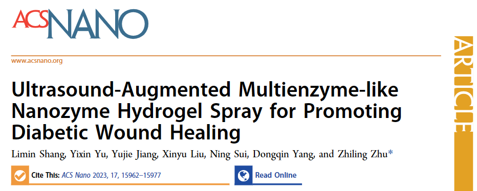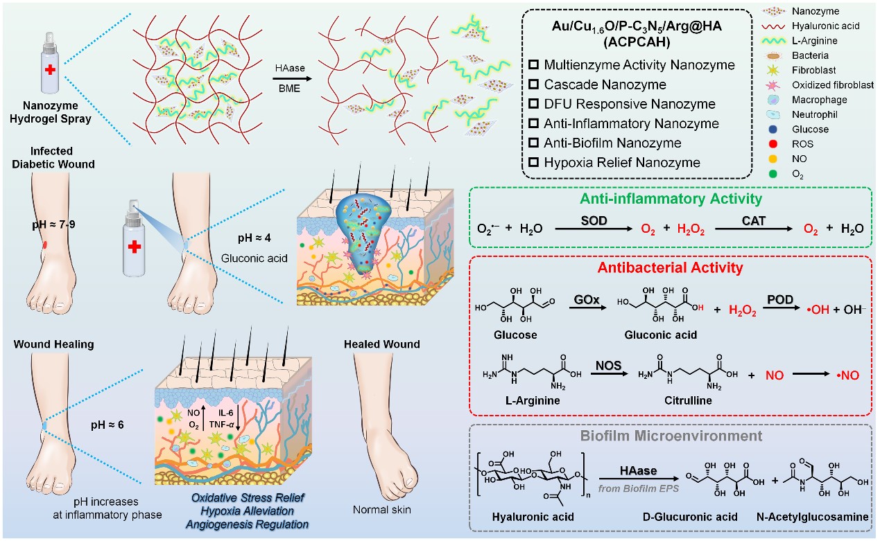 近日,材料学院朱之灵副教授发表了多酶活性纳米酶药物治疗DFU的论文,该成果以“Ultrasound-Augmented Multienzyme-like Nanozyme Hydrogel Spray for Promoting Diabetic Wound Healing”为题,发表在纳米材料领域国际著名期刊ACS Nano(中科院一区TOP期刊,影响因子17.1)上。该成果第一单位为365完美体育,第一作者为材料学院研究生商利敏,通讯作者为朱之灵副教授。该研究利用透明质酸包裹精氨酸、超小金纳米颗粒和Cu1.6O纳米颗粒共同负载掺磷氮化石墨碳纳米片,开发了一种超声增强的多酶活性纳米酶水凝胶喷雾剂(ACPCAH)。这种纳米酶水凝胶喷雾剂具有五种类酶活性,包括类超氧化物歧化酶(SOD)、类过氧化氢酶(CAT)、类葡萄糖氧化酶(GOx)、类过氧化物酶(POD)和类一氧化氮合酶(NOS)。通过体外和体内实验均证明,这种纳米酶水凝胶喷雾剂可被DFU微环境激活,起到减轻炎症、缓解缺氧、降低血糖、促进血管生成、消除致病菌的作用,有效加速糖尿病伤口愈合。该研究建立了一种基于纳米酶多酶活性的新型疗法,可用于开发一体化的DFU疗法。