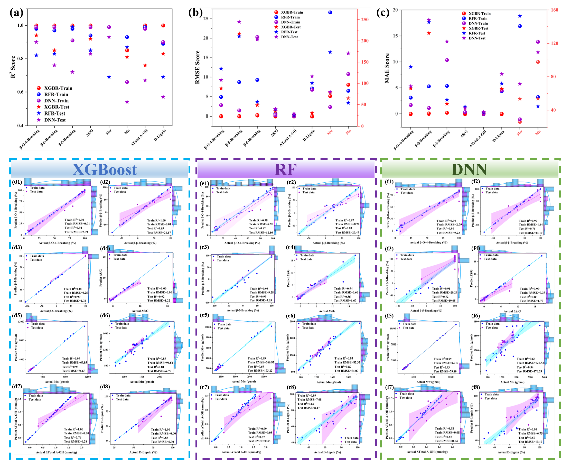 近日,化工学院青年教师徐环斐副教授团队在基于人工智能机器学习的低共熔溶剂体系木质纤维高值化利用研究领域取得新进展。相关研究成果以“Machine learning prediction of delignification and lignin structure regulation of deep eutectic solvents pretreatment processes”为题目,发表在生物质化工研究领域国际知名期刊Industrial Crops & Products (SCI一区TOP期刊),论文DOI链接为doi.org/10.1016/j.indcrop.2023.117138。论文基于机器学习研究了含路易斯酸的三元低共熔溶剂预处理木质纤维素类生物质过程中生物质的结构参数、溶剂物理化学参数和预处理条件与木质素脱除效率之间的内在关系,揭示了相互作用机制。采用多种机器学习模型以木质素的结构参数为目标变量进行了预测,模型具有较高的精准度。论文第一作者为化工学院2022级硕士研究生葛瀚文,通讯作者为徐环斐,365完美体育为第一单位和唯一通讯单位。