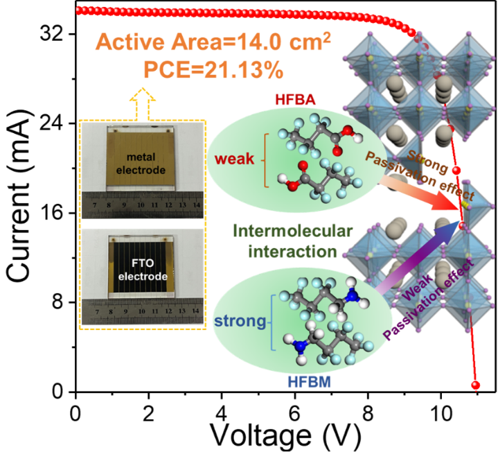 引入的F基团可以有效增加钝化剂的钝化效果,但是已报道的工作仅仅聚焦于钝化剂分子上引入的F基团可以有效提高钙钛矿电池的性能和稳定性的效果。然而,F基团与钝化剂分子中原有钝化基团之间的相互作用对钝化剂钝化能力的影响通常被忽略。因此,为了深入了解F基团在钝化分子中的作用机制,相关研究人员选择多种氟化钝化剂分子作为研究模板。经过一系列研究发现F基团除了可以直接与钙钛矿薄膜中缺陷相互作用来提高钝化效果外,还与钝化剂分子中原有钝化基团相互作用,影响其电子云分布,从而改变其与非配位Pb2+的钝化效果。在此基础上,研究人员构筑小面积钙钛矿太阳能电池效率为24.70%,大面积钙钛矿模块器件(14 cm2)效率高达21.13%。这些结果为F基团在钝化剂中的作用机理提供新的理解,为钙钛矿太阳能电池大规模工业化发展提供新的知识储备和技术指导。
