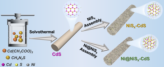 鉴于此,材料学院李镇江教授团队制备了一种非晶型的Ni@NiSx助催化剂,并通过部分还原策略将其组装到CdS上形成非晶-晶体Ni@NiSx-CdS复合光催化剂,并提出活性位点富集和活性位点电子结构调控的有效耦合策略,进而大大提高了CdS的光催化析氢性能。