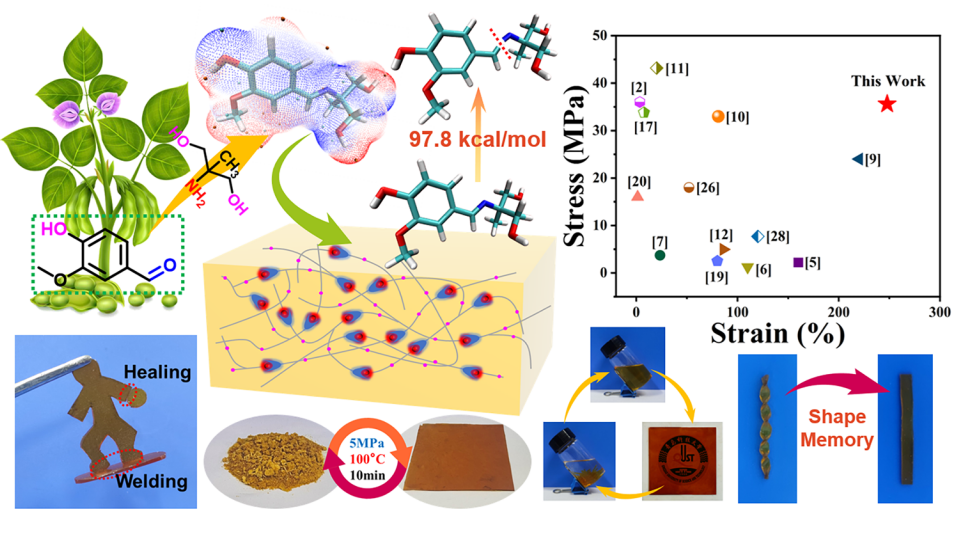 针对此问题,团队提出了一种新型的韧性调控策略,利用电子离域效应和协调交联点的设计,在对材料增韧的同时降低力学强度的损失。借助刚性苯环与亚胺键的共轭互补影响电子云分布,有效降低了交联网络中亚胺键交换的能垒,亚胺键解离能可从170.75 kcal/mol降低到97.80 kcal/mol。在相同温度下,动态共价键的交换速率加快,更有利于材料在现实条件下的功能化。团队所合成的vitrimer材料具有良好的焊接、愈合和形状记忆性能。该工作以“Functional bio-based vitrimer with excellent healing and recyclability based on conjugated deflection self-toughening”为题发表于化工领域Top期刊《Chemical Engineering Journal》(https://doi.org/10.1016/j.cej.2023.145680),365完美体育为论文的第一单位,化工学院高传慧教授为通讯作者,2021级硕士研究生陈丕成为第一作者。